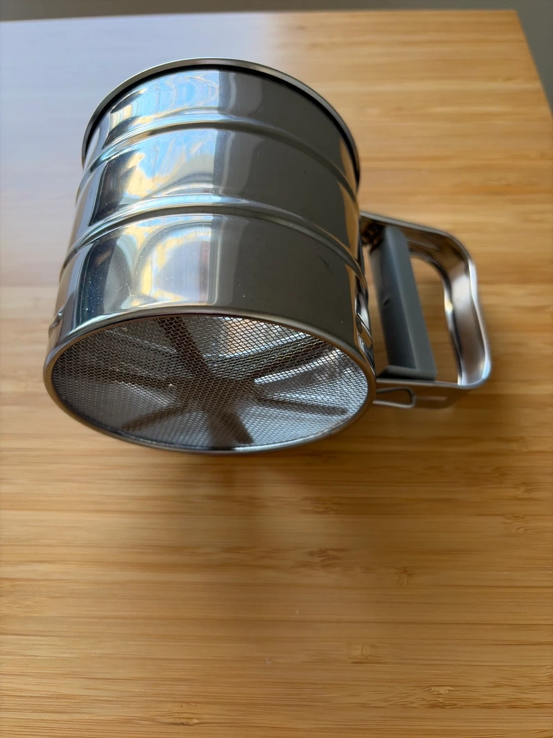 This is a stainless steel flour sifter with a comfortable handle. It's designed for sifting dry ingredients like flour, cocoa powder, and powdered sugar. The fine mesh ensures a smooth texture in your baking. Easy to operate with a squeeze handle!