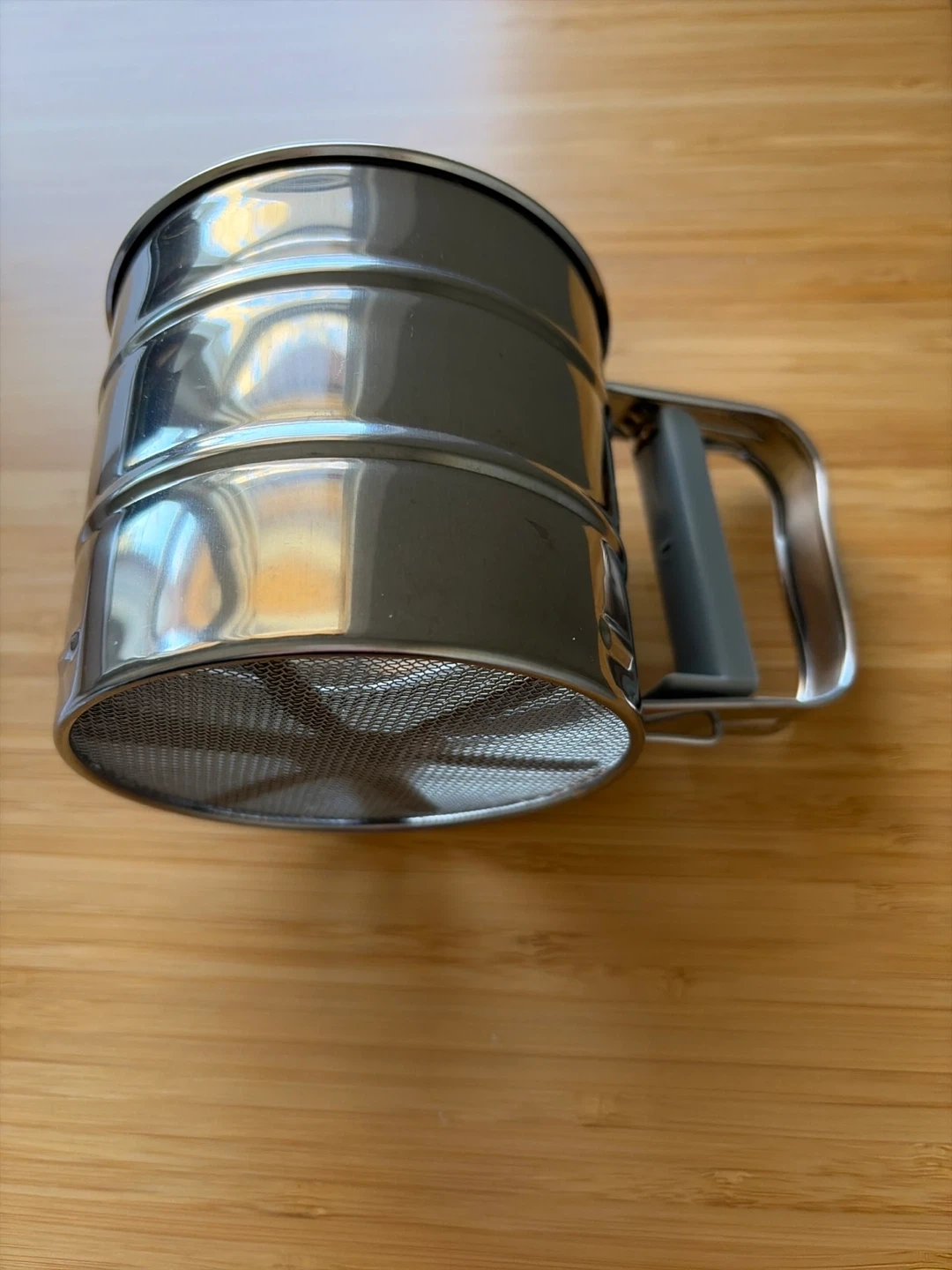 This is a stainless steel flour sifter with a comfortable handle. It's designed for sifting dry ingredients like flour, cocoa powder, and powdered sugar. The fine mesh ensures a smooth texture in your baking. Easy to operate with a squeeze handle!