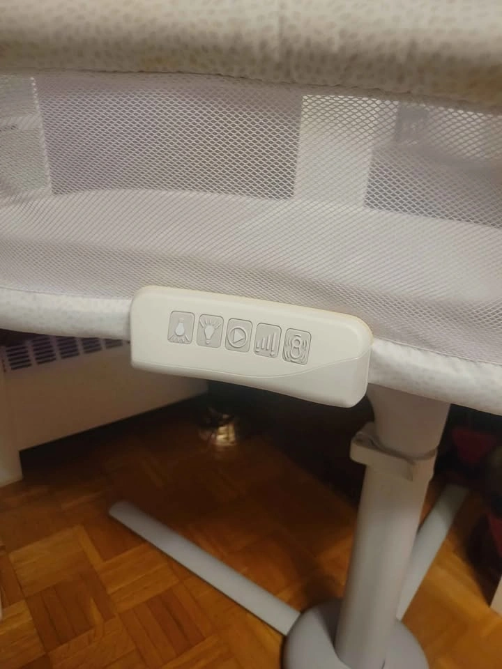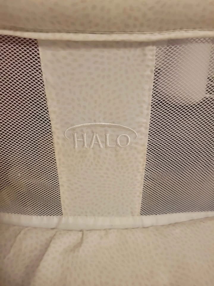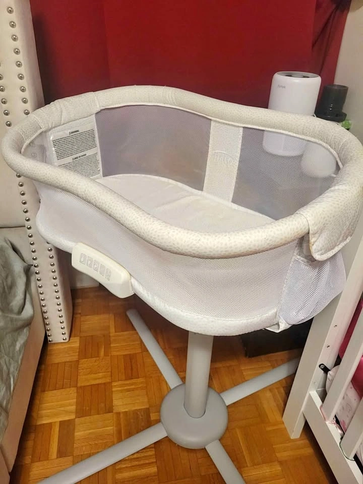 HALO Baby bassinet with swivel design, vibration, sounds, and nightlight. Grey/white pattern. Retail price $350, selling for $60