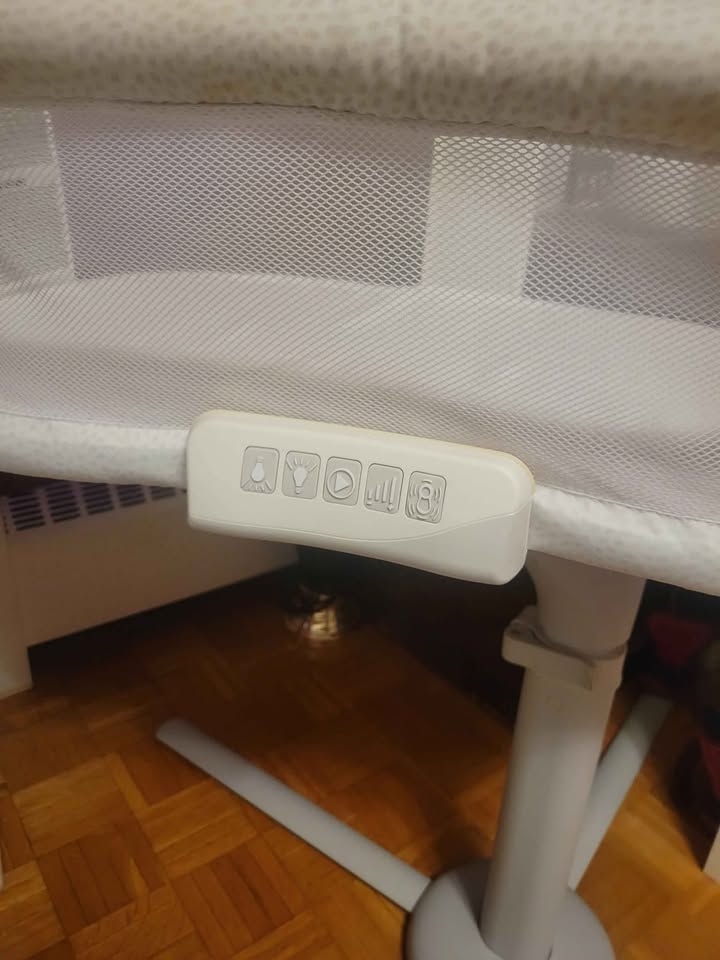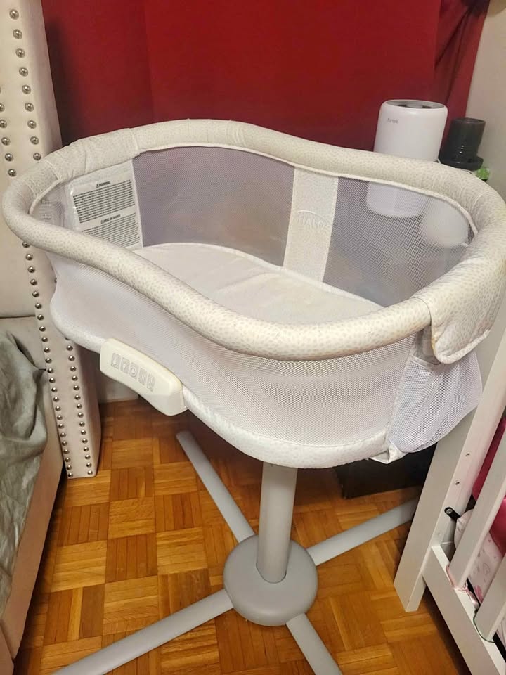 HALO Baby bassinet with swivel design, vibration, sounds, and nightlight. Grey/white pattern. Retail price $350, selling for $60