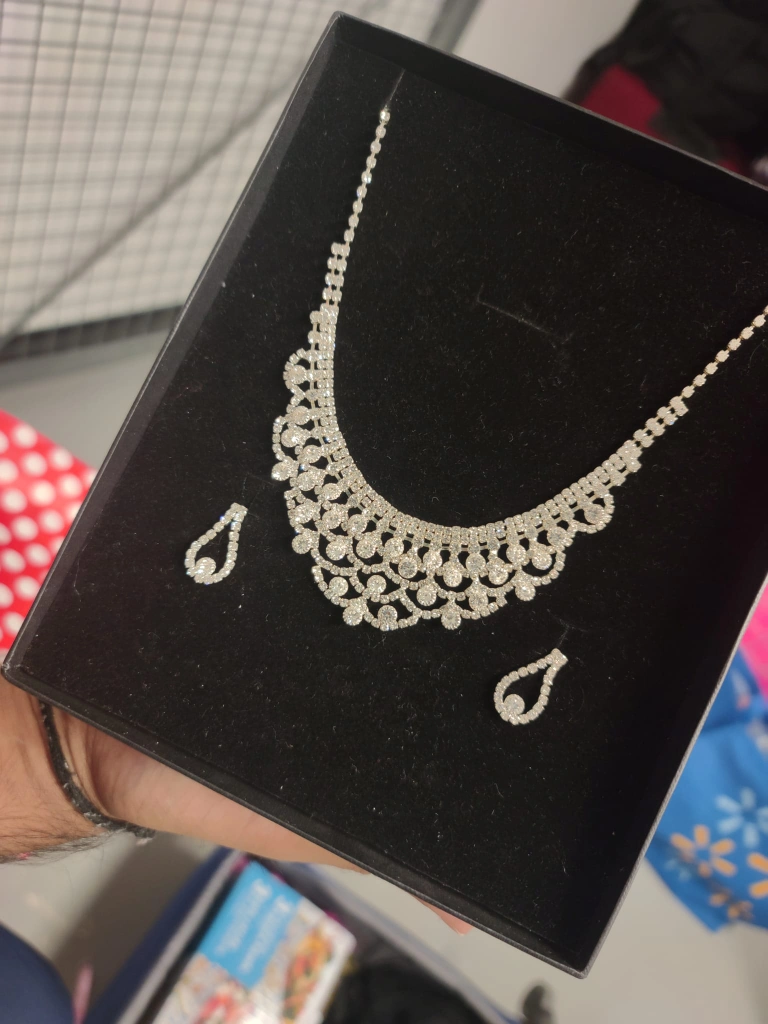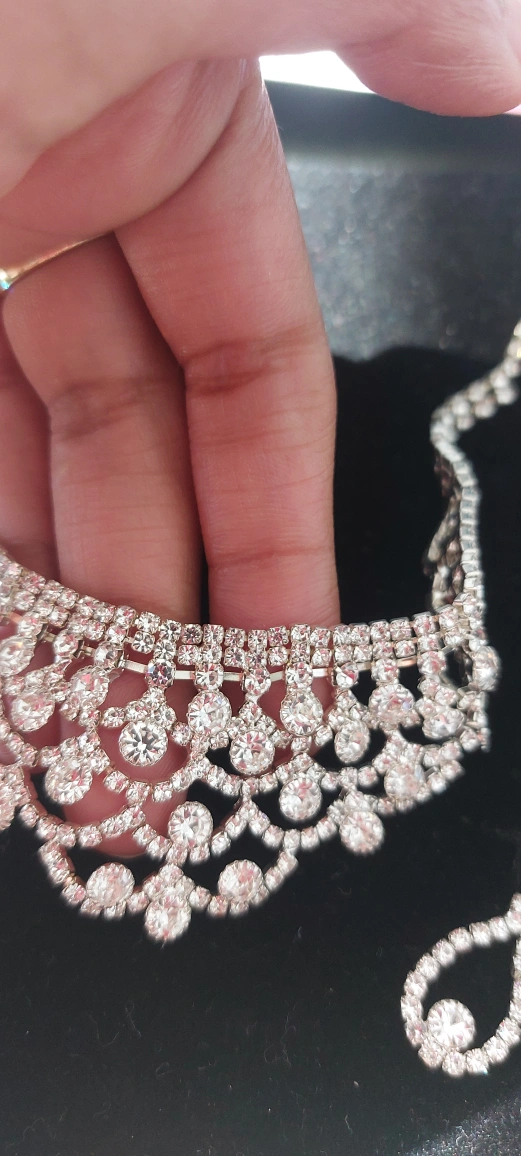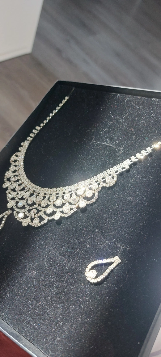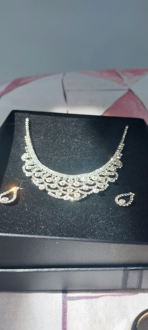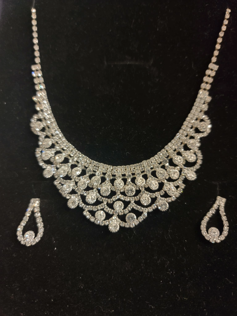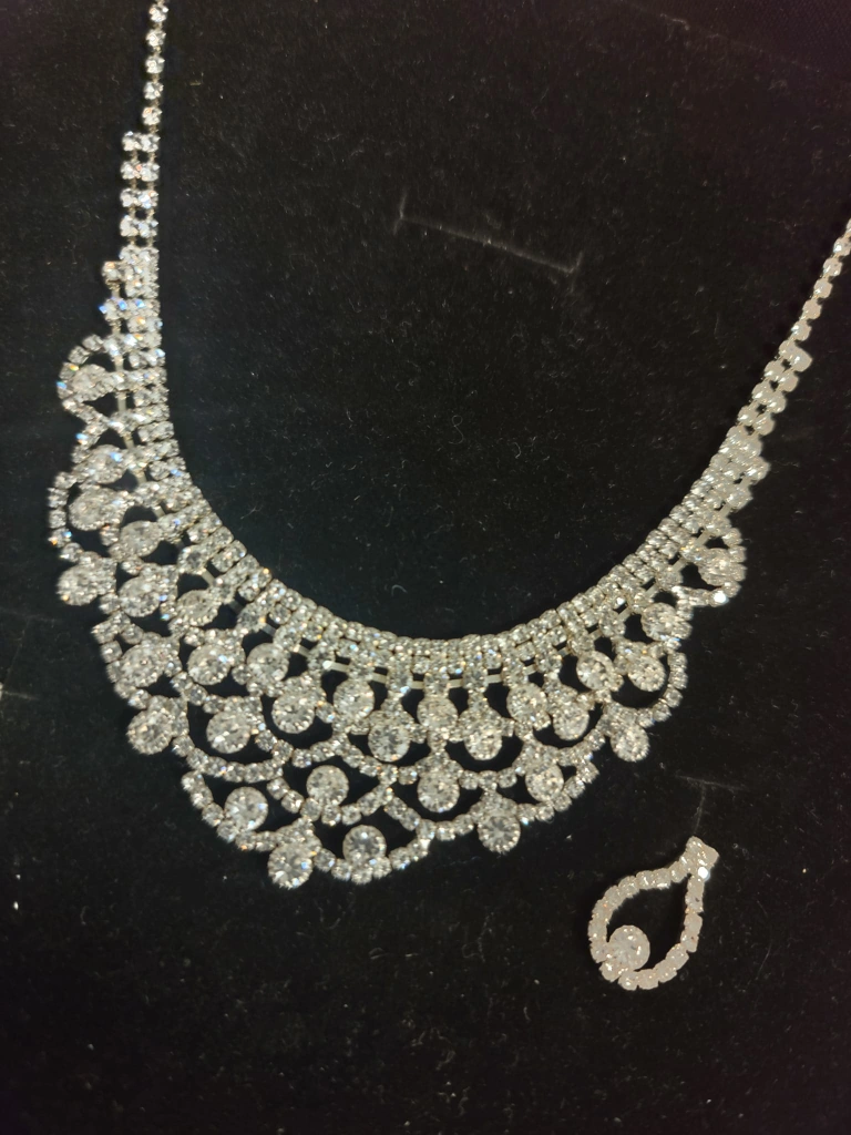 Beautiful, sparkly, and elegant rhinestone necklace and earrings set. Perfect for a special occasion or evening out. The necklace has a delicate, feminine design with a variety of crystal sizes and shapes. The matching earrings have a teardrop shape with a single large crystal at the bottom. Both the necklace and earrings are silver-toned.