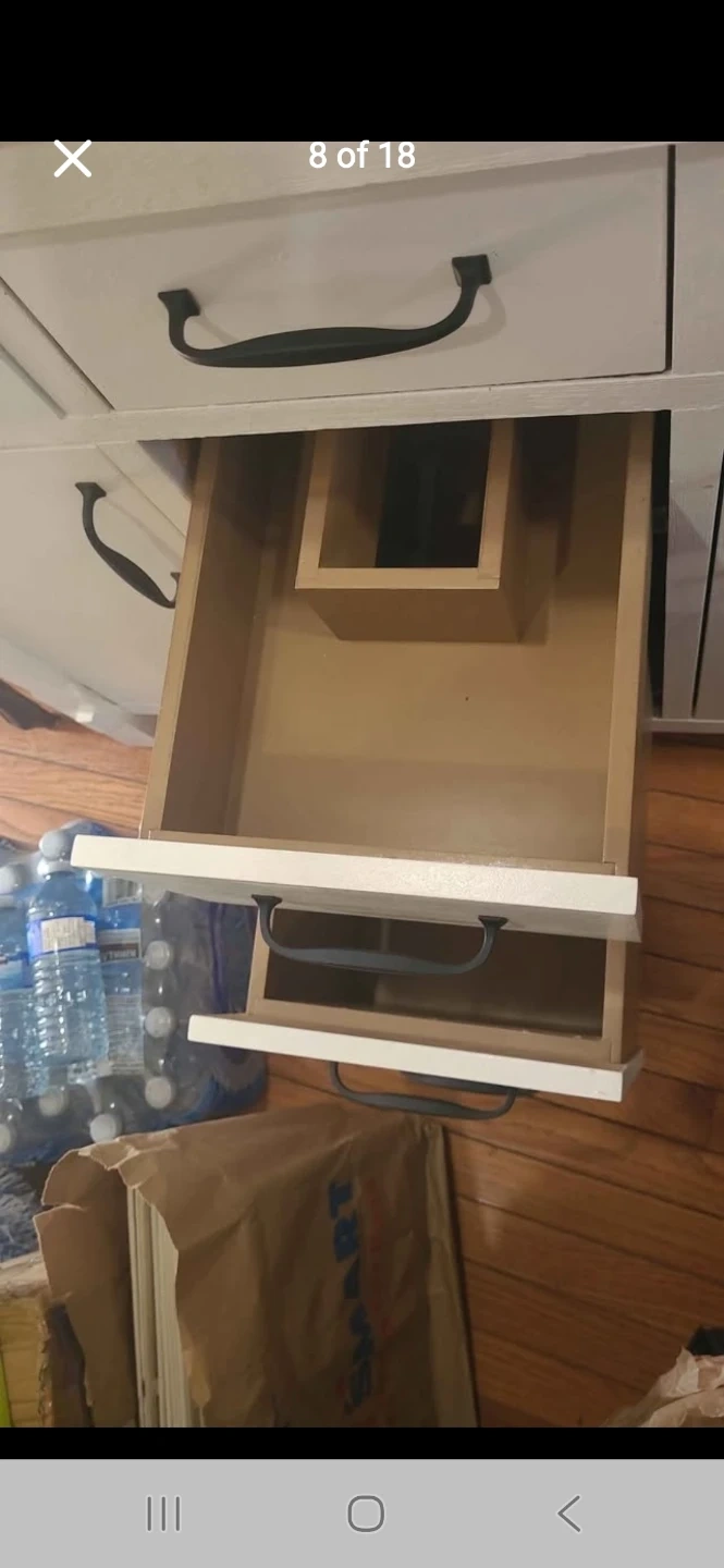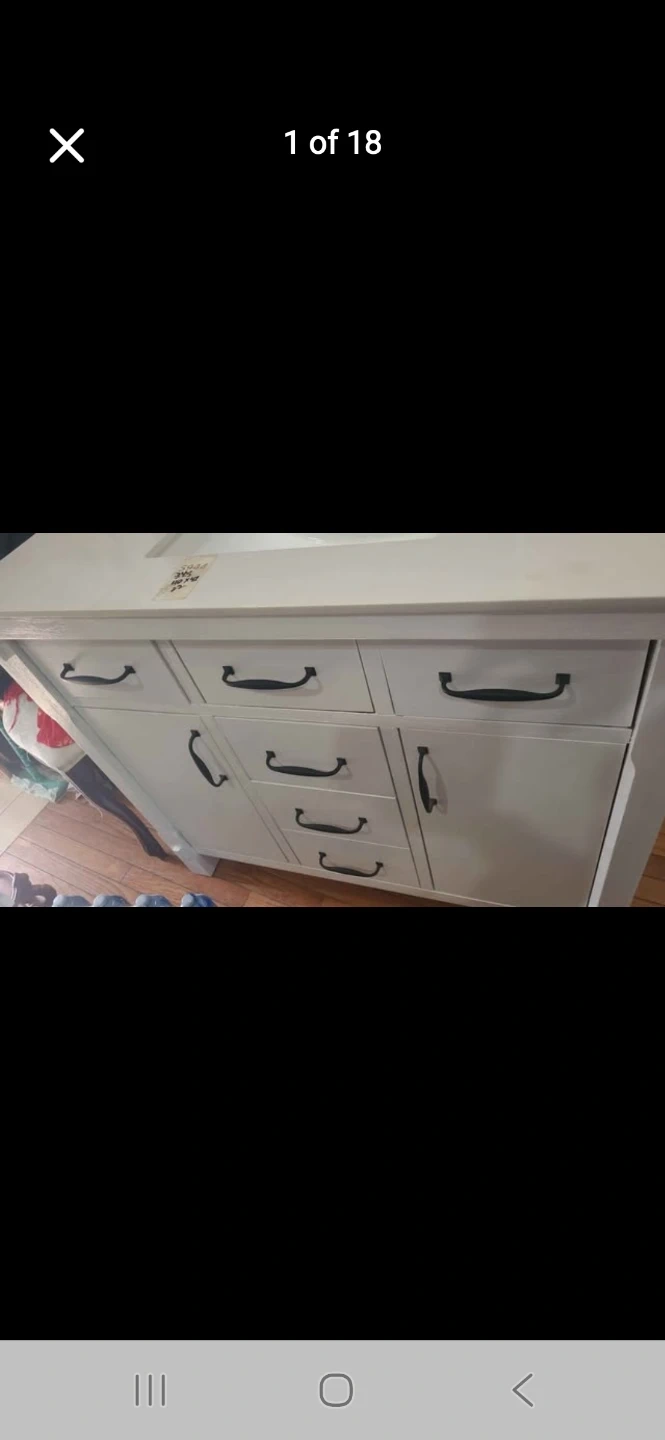 White soild wood vanity set with a porcelain sink and black hardware. It features multiple drawers and a cabinet for ample storage. Perfect for organizing bathroom essentials.