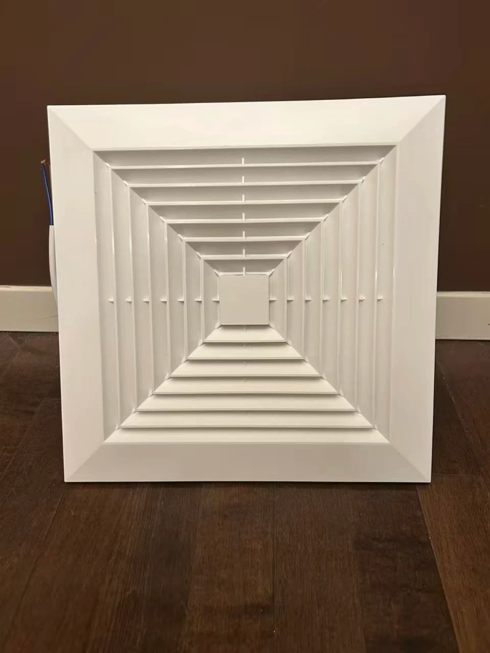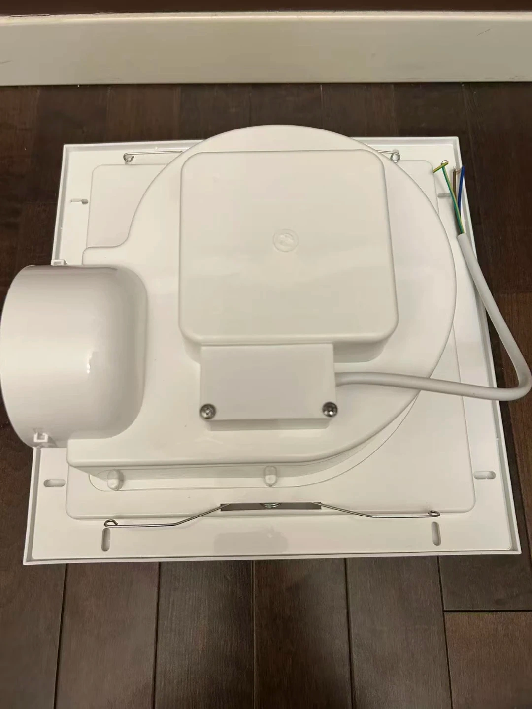White ceiling ventilator fan with a 10-inch panel size and 25cm opening size. It has a power of 38W and a thickness of 12cm. The diameter of the duct is 10cm. This vent fan helps to improve air circulation in your home.
