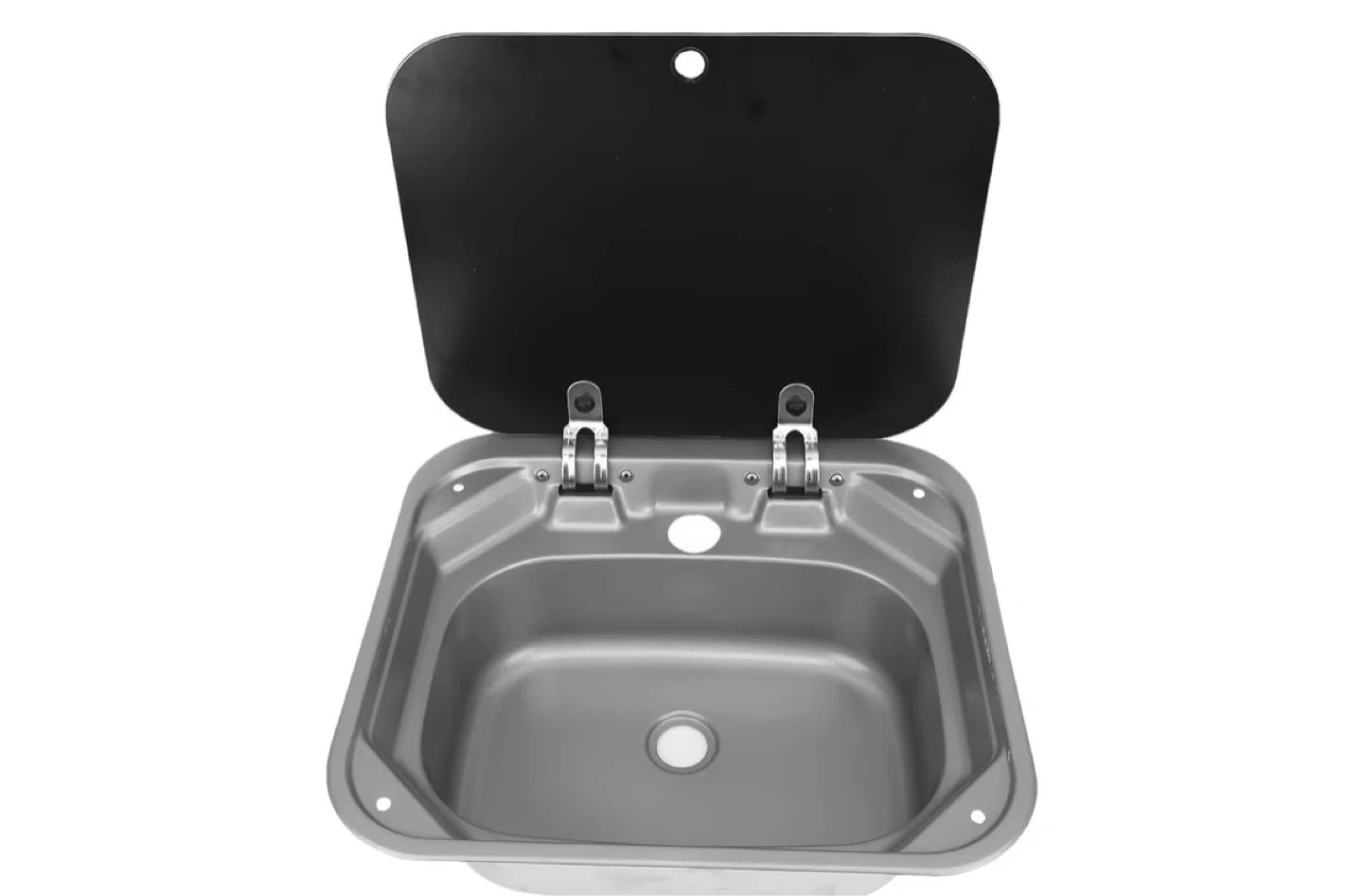 This is a stainless steel RV sink. It's made from durable stainless steel and includes a black cover. The sink is 373mm high, with the bowl measuring 438mm by 345mm. It's great for use in RVs or campers!