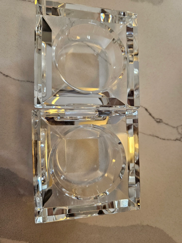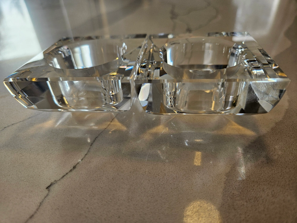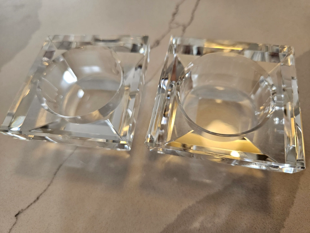 Two square crystal candle holders. Clear glass. Elegant design. Perfect for small candles or votives. Signed by designer Oleg Cassini. Vintage