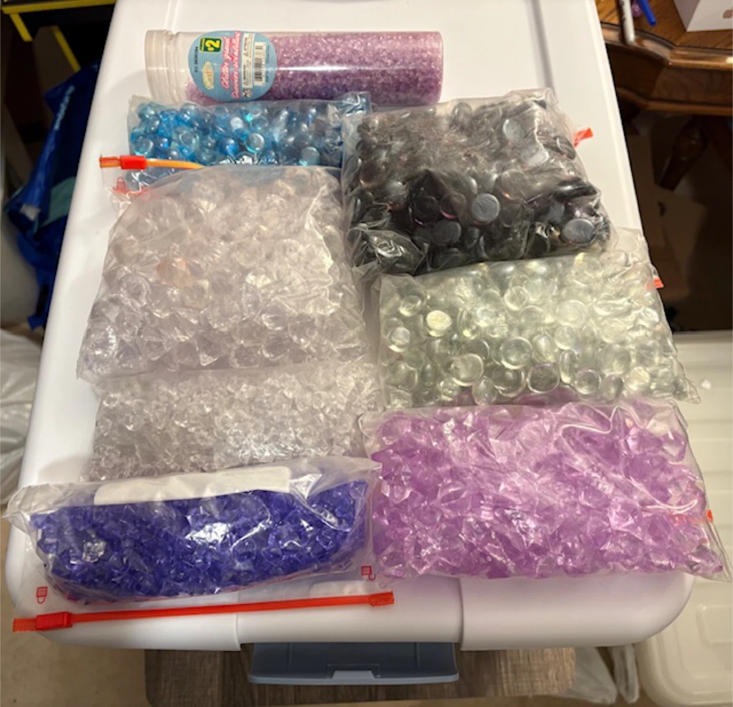 Assorted bags of decorative glass gems, perfect for crafts and home decor! There are several colours available and the lot completely fills a large Nike shoe box 🤩