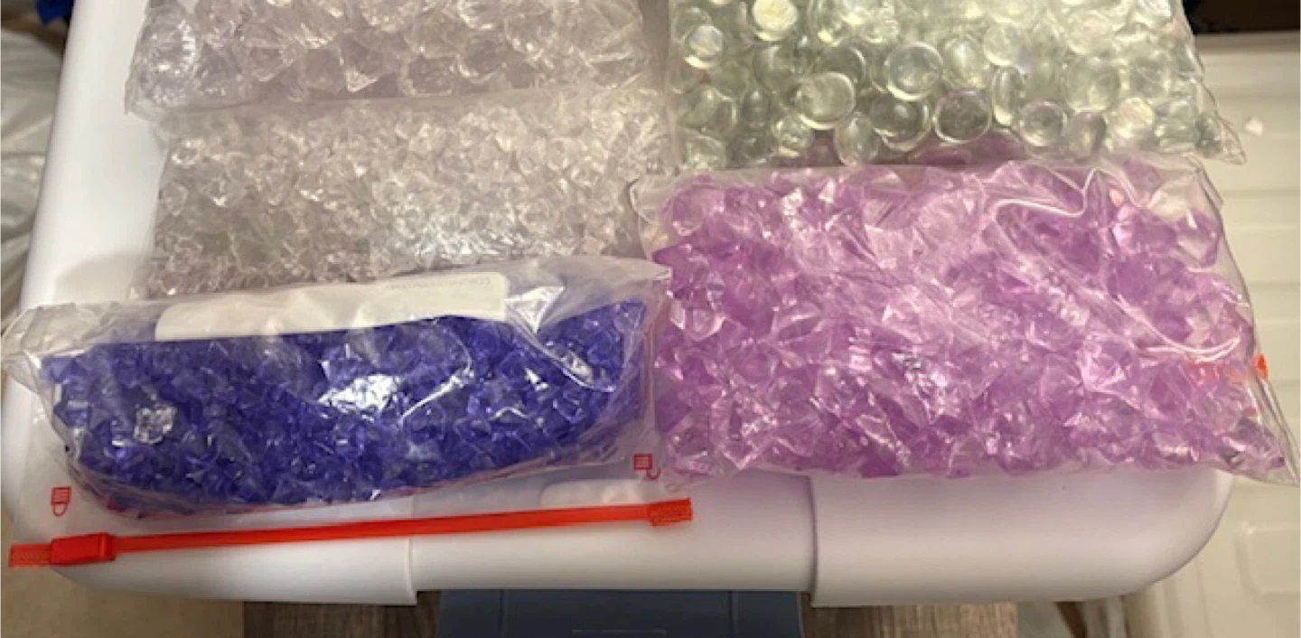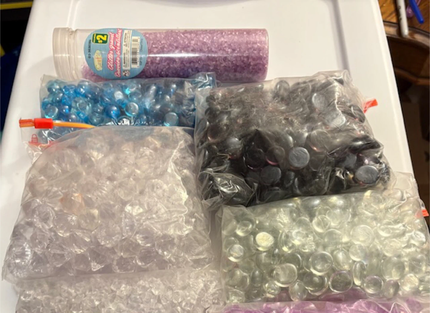 Assorted bags of decorative glass gems, perfect for crafts and home decor! There are several colours available and the lot completely fills a large Nike shoe box 🤩
