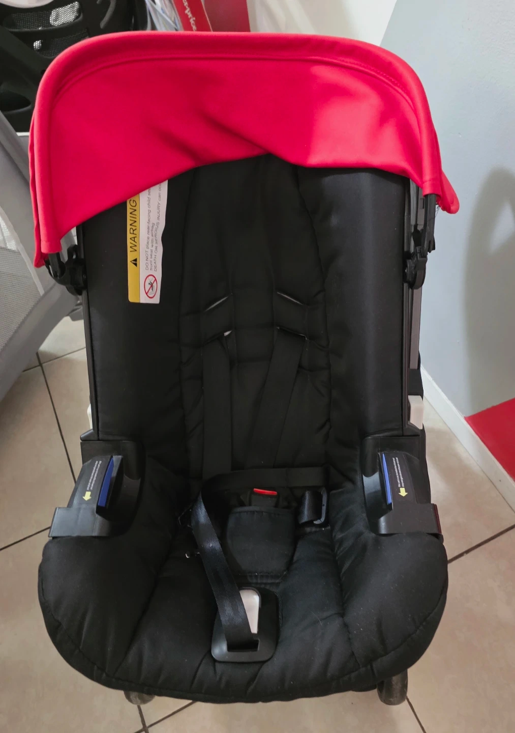This is a black and red infant car seat and stroller. It's designed for easy travel and convenience for parents on the go. Includes harness.