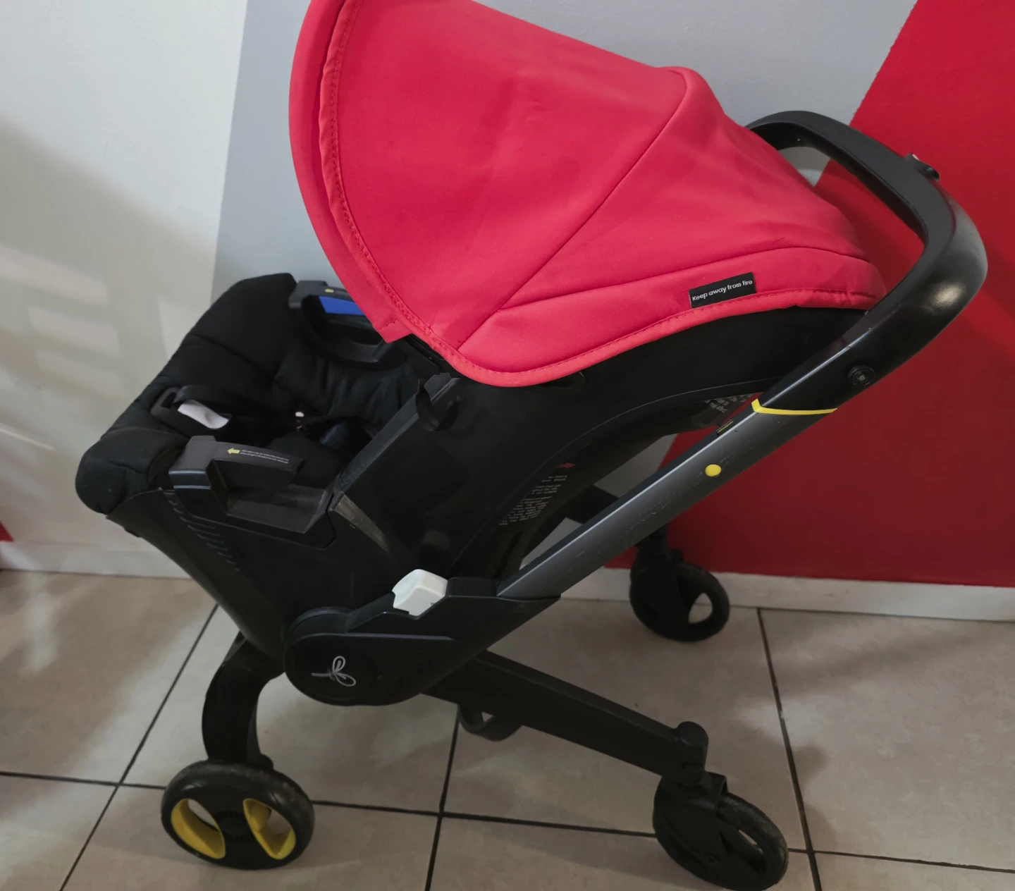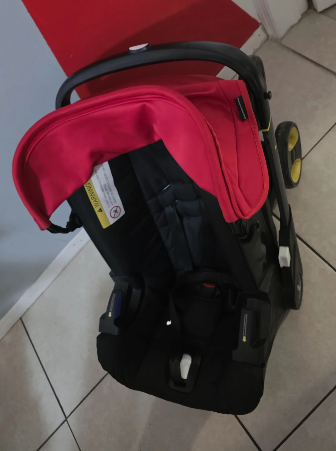 This is a black and red infant car seat and stroller. It's designed for easy travel and convenience for parents on the go. Includes harness.