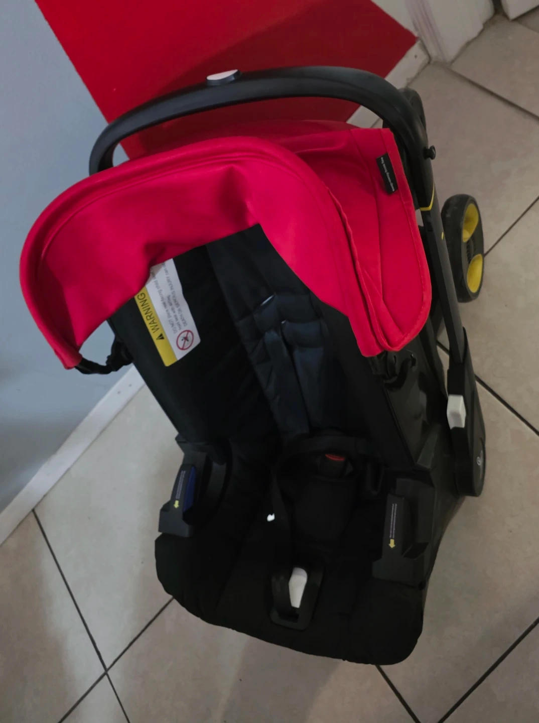 This is a black and red Doona infant car seat and stroller. It's designed for easy travel and convenience for parents on the go. Includes harness.