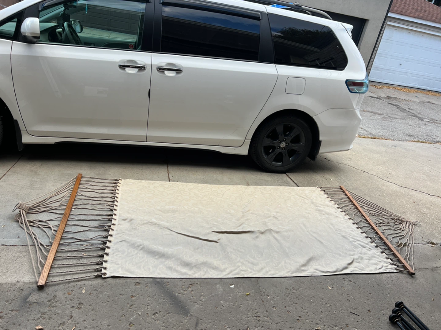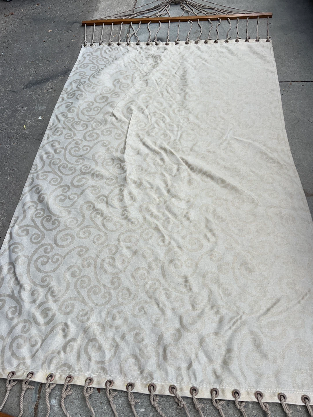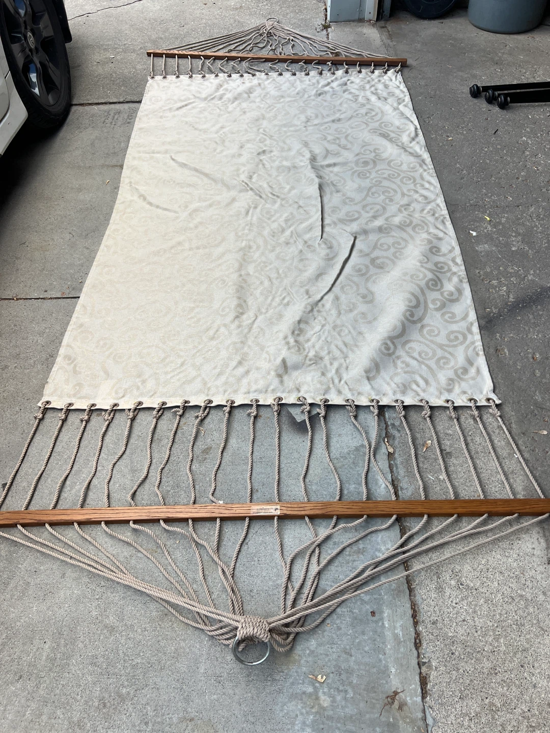 Selling a hammock featuring a beige patterned fabric. It has wooden supports and rope detailing. Great for relaxing outdoors! No posts