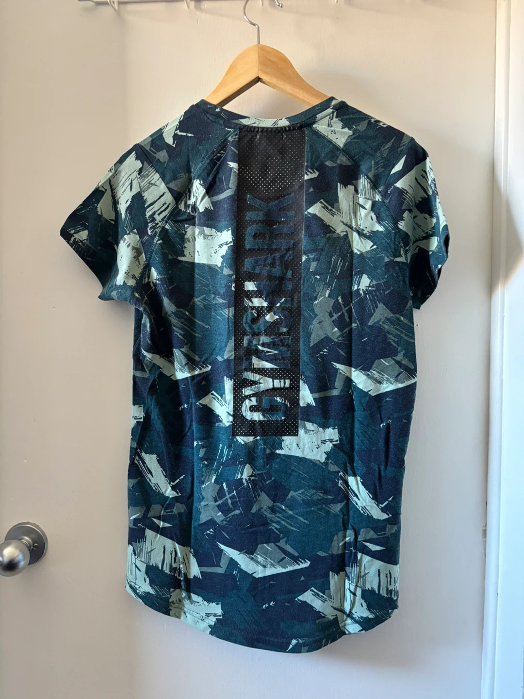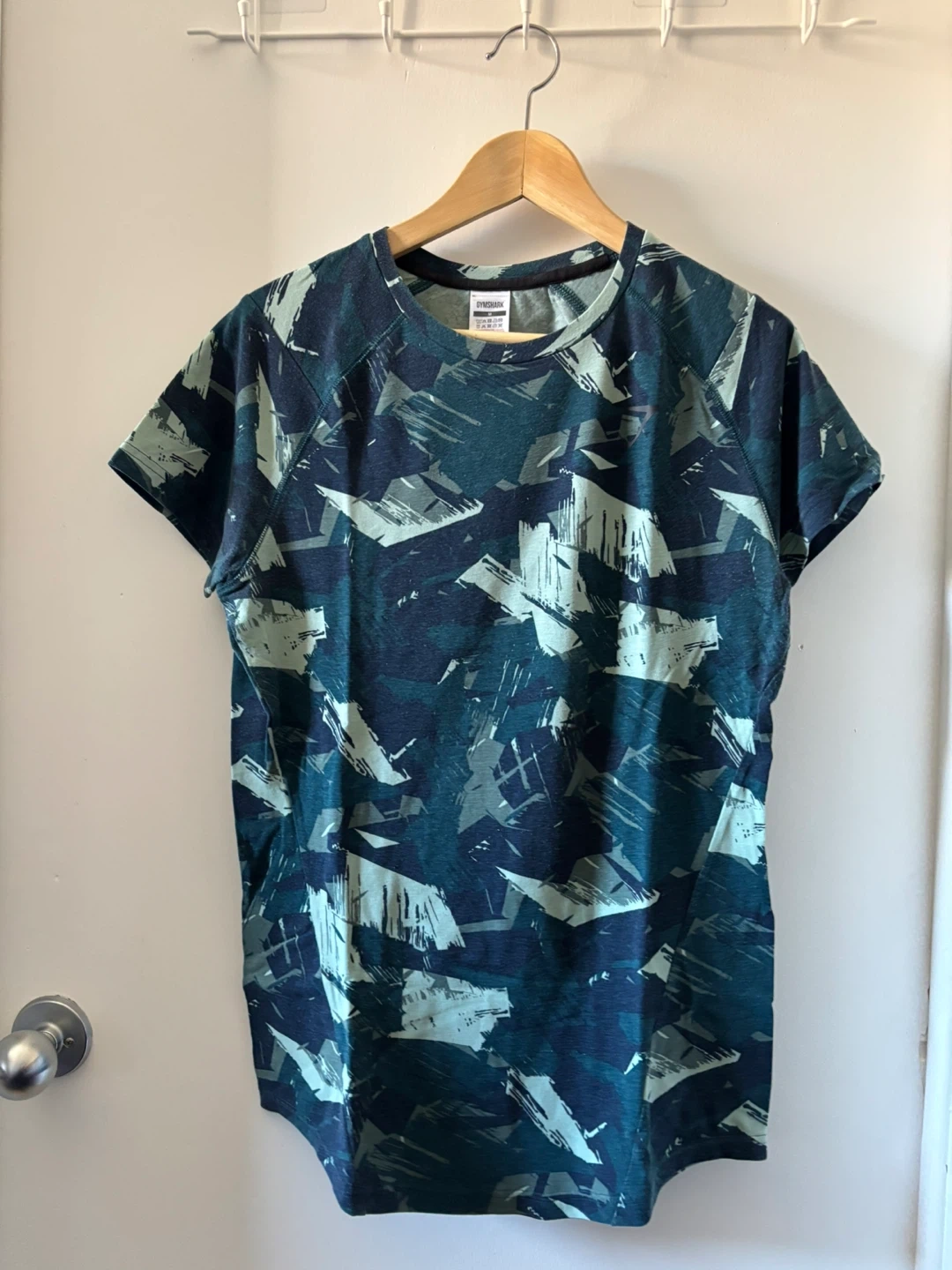 Men's Gymshark t-shirt in a blue and green camo pattern. It's a size medium with a breathable mesh panel on the back. Short sleeves and crew neck. Slim fit.