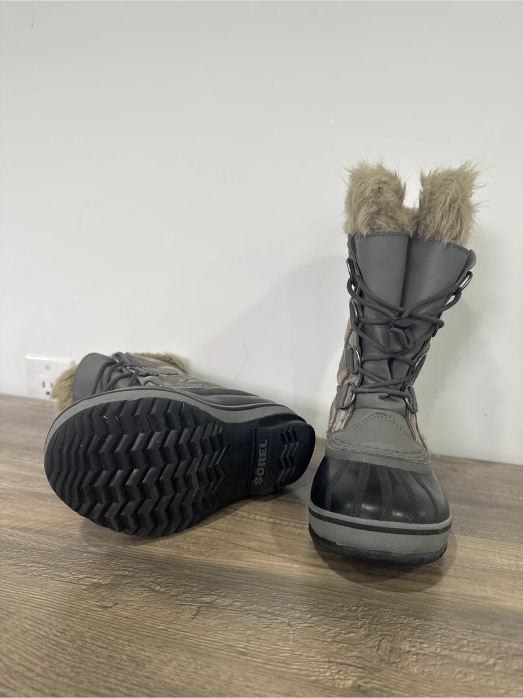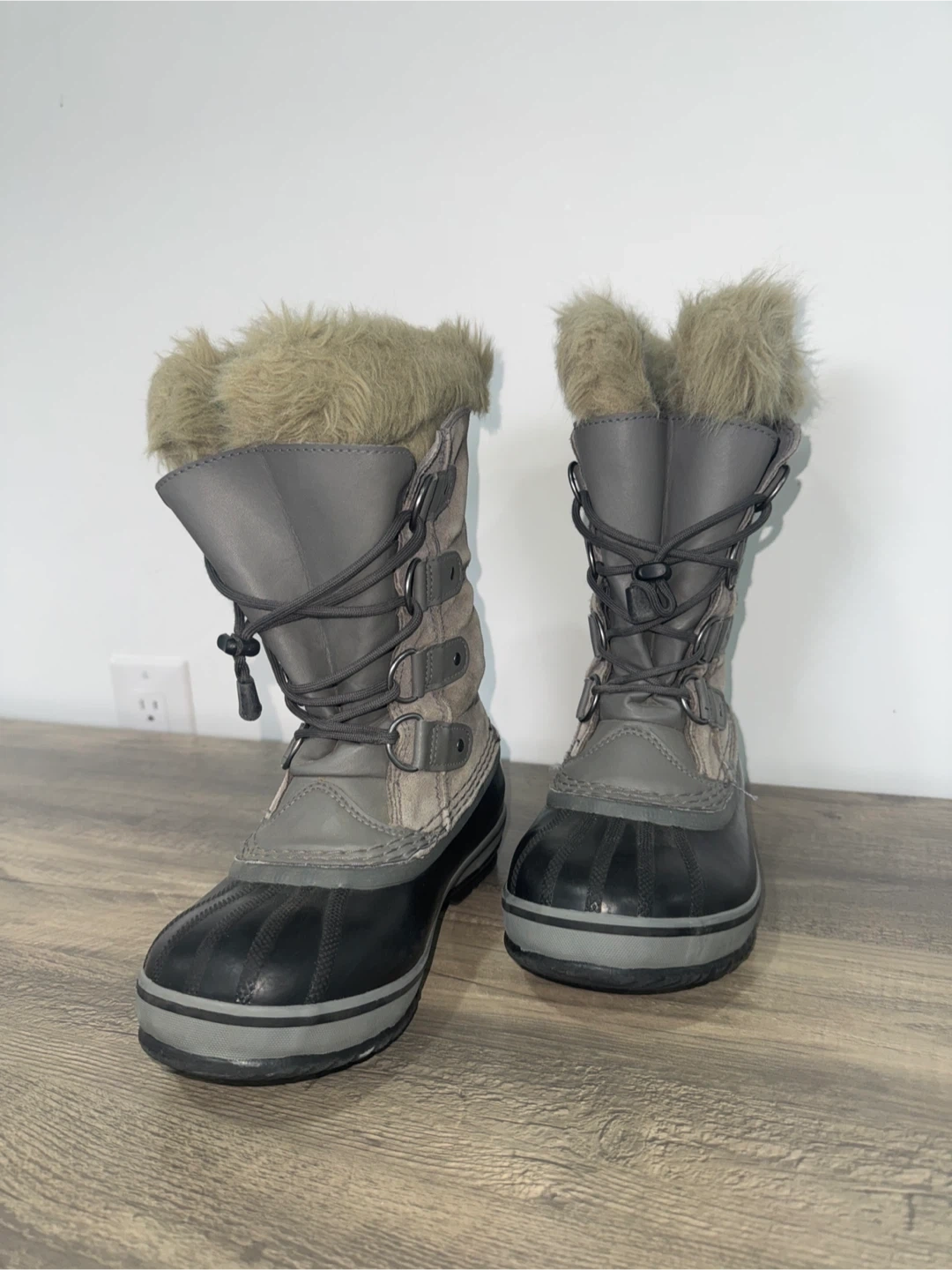Sorel women's winter boots in a grey and black colourway. They feature a warm, insulated lining and a waterproof exterior.