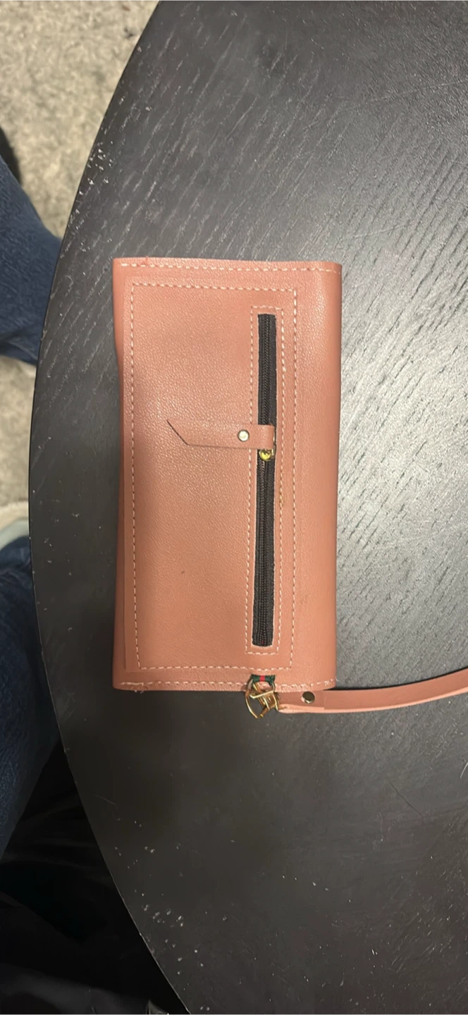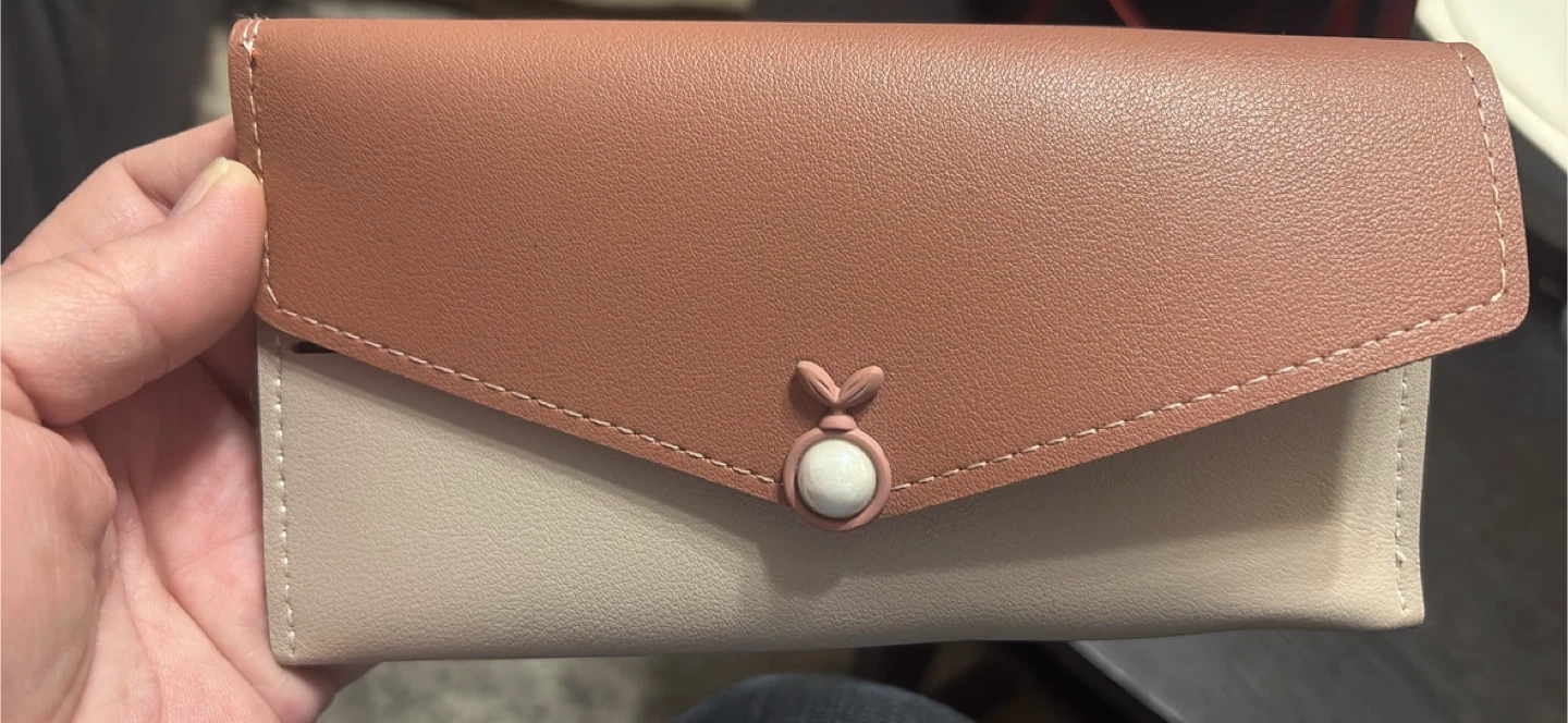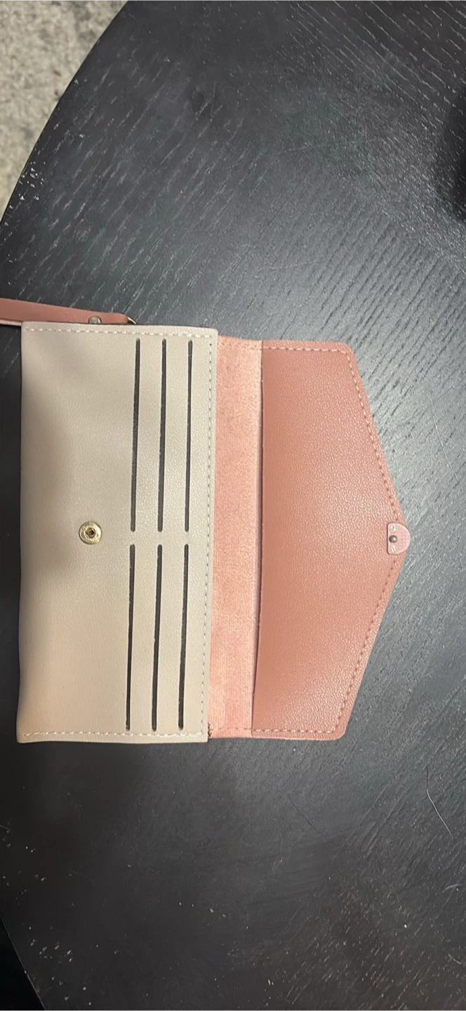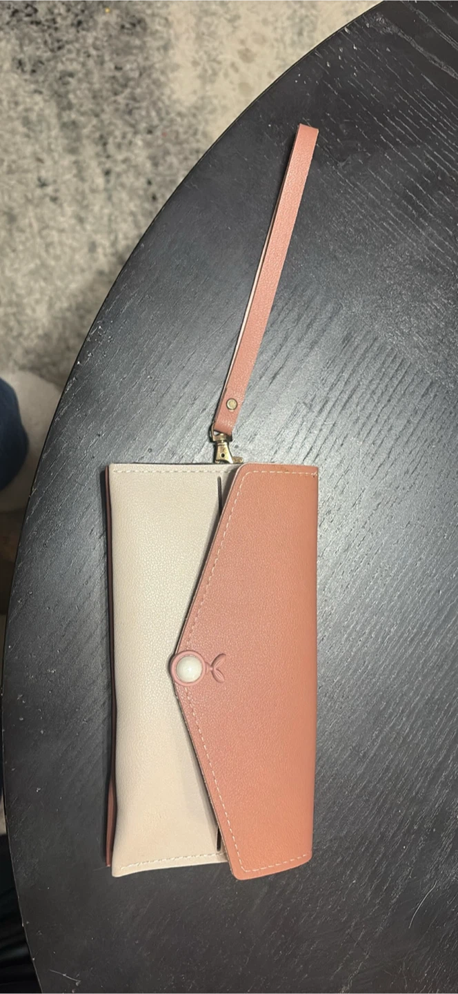 This stylish bi-fold wallet clutch is designed for everyday use. It's crafted from faux leather and features multiple card slots and a zippered pocket. A detachable wrist strap is included for convenience.