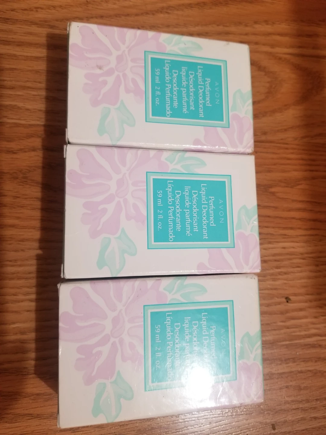 Three boxes of Avon perfumed liquid deodorant are available. Each bottle contains 59 ml or 2 fl. oz. This deodorant is lightly perfumed.