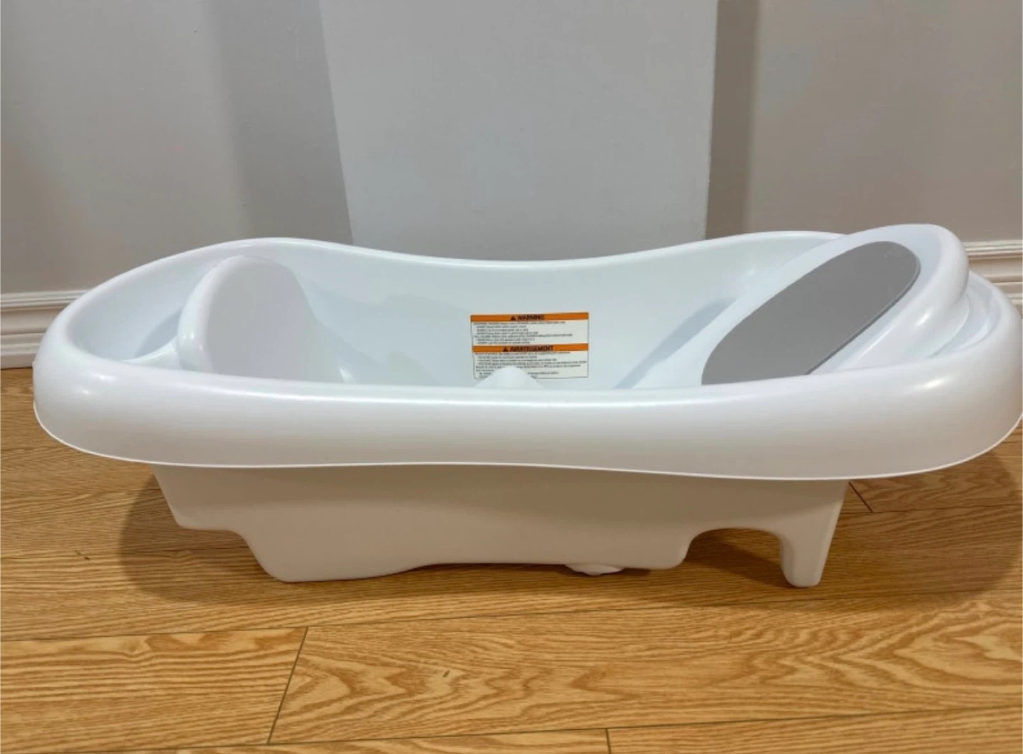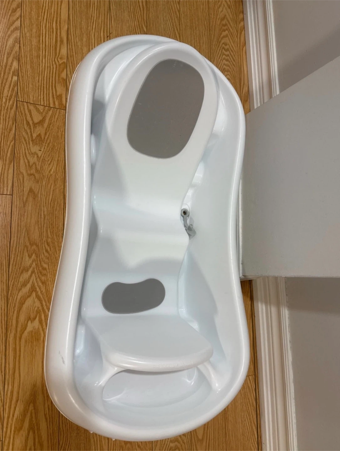 This white infant bath tub is designed for babies . It features a non-slip surface and a reclined seat for newborns, plus a standing support for sitters. It's a great tub for bath time with your little one!