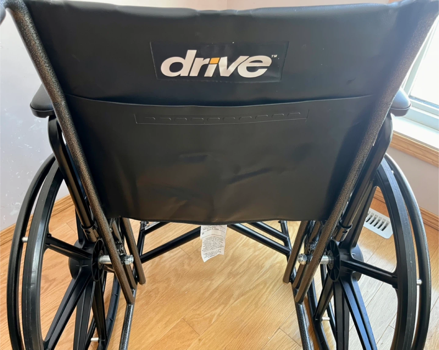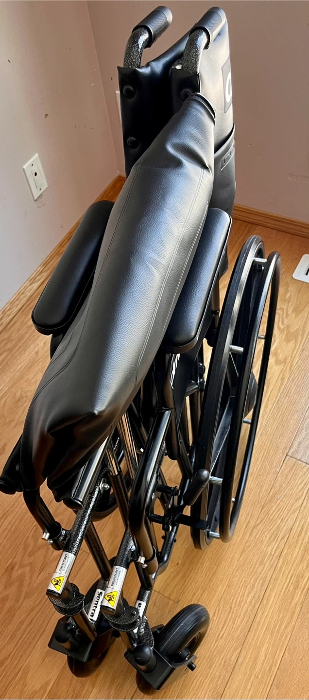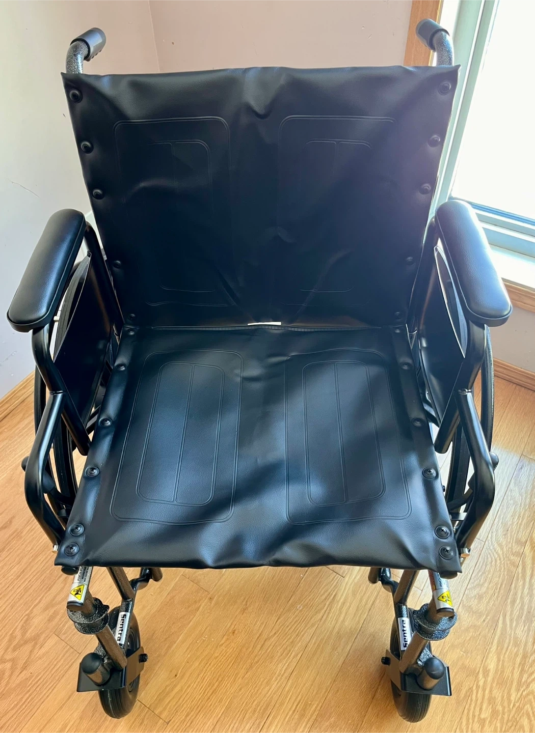This is a New Drive Sentra heavy-duty wheelchair black. It features a durable black vinyl seat and backrest. The chair includes adjustable footrests for added comfort and support. It's designed for reliable mobility assistance. Big front wheels for outdoors, New seat cushion included, 500 lbs max weight 20” seat. $500 obo delivery available or you can pick up at my home.