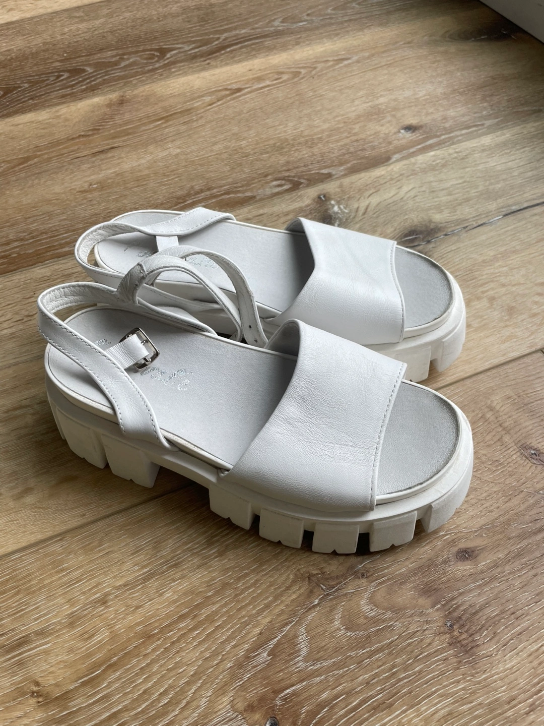 Women's white leather platform sandals. Ankle strap closure. Size 37. Chunky platform sole. Open toe design.