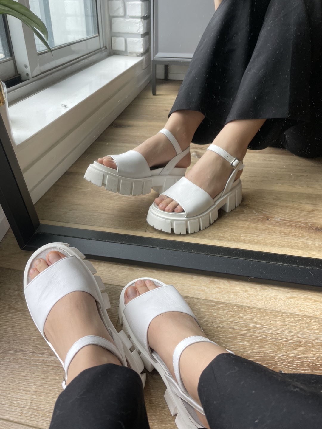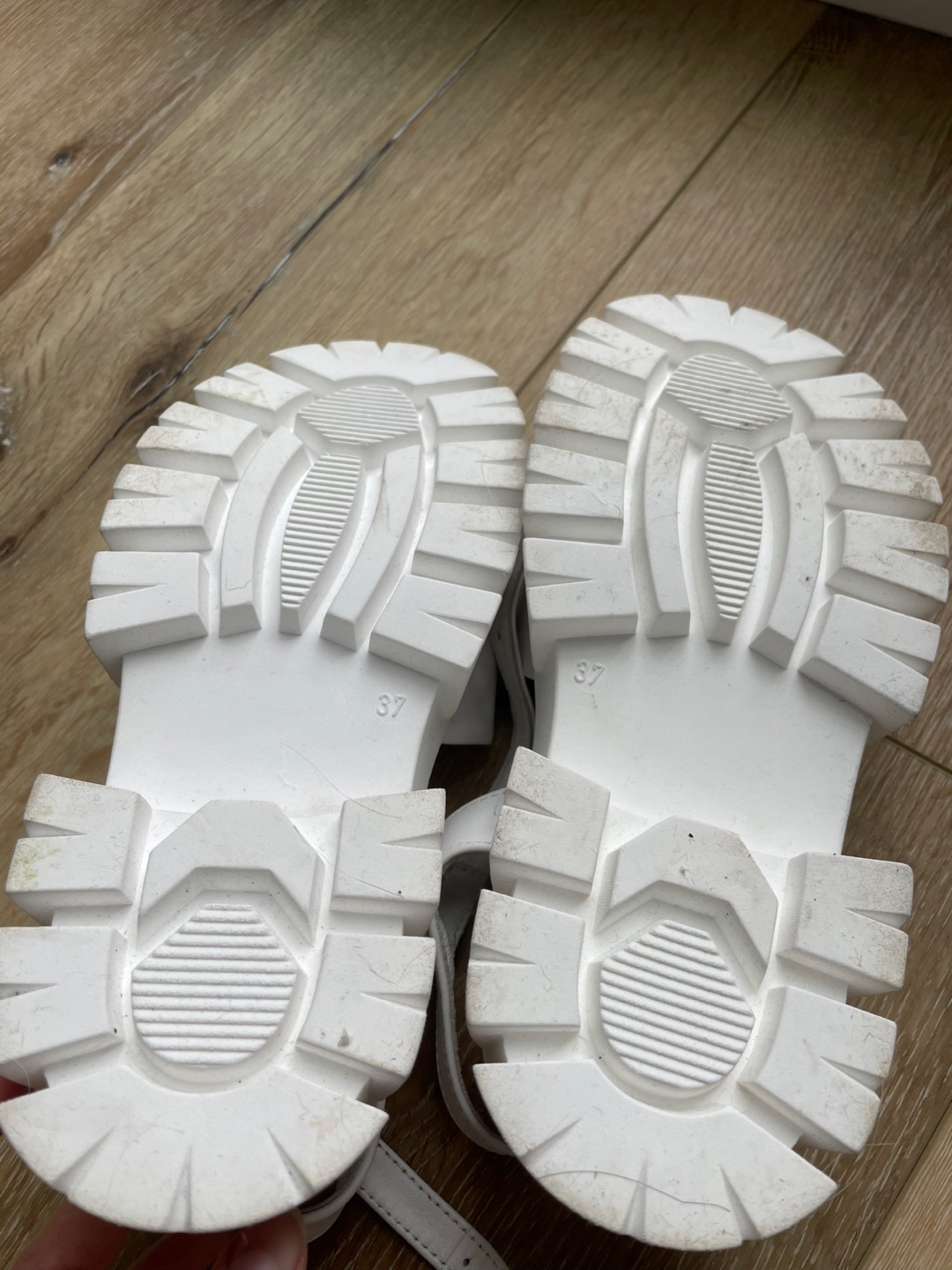 Women's white leather platform sandals. Ankle strap closure. Size 37. Chunky platform sole. Open toe design.