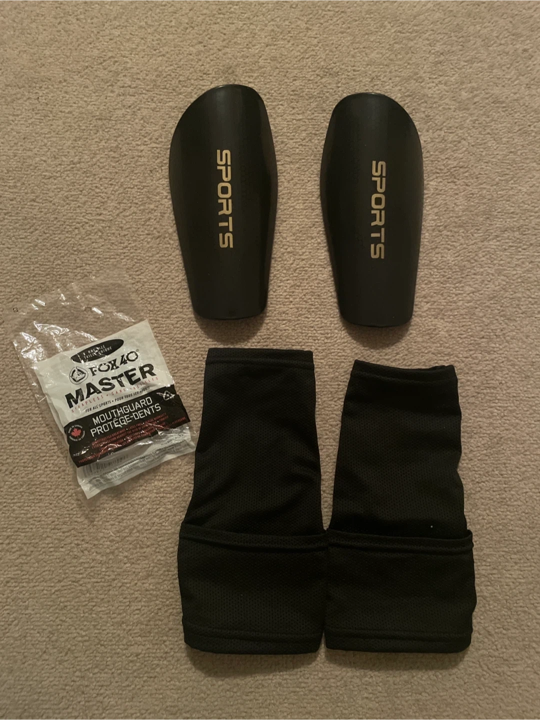 Selling a pair of shin guards with sleeves and a Fox 40 Master mouthguard. The shin guards have 'SPORTS' printed on them. Perfect for any sport where you need a bit of extra protection!