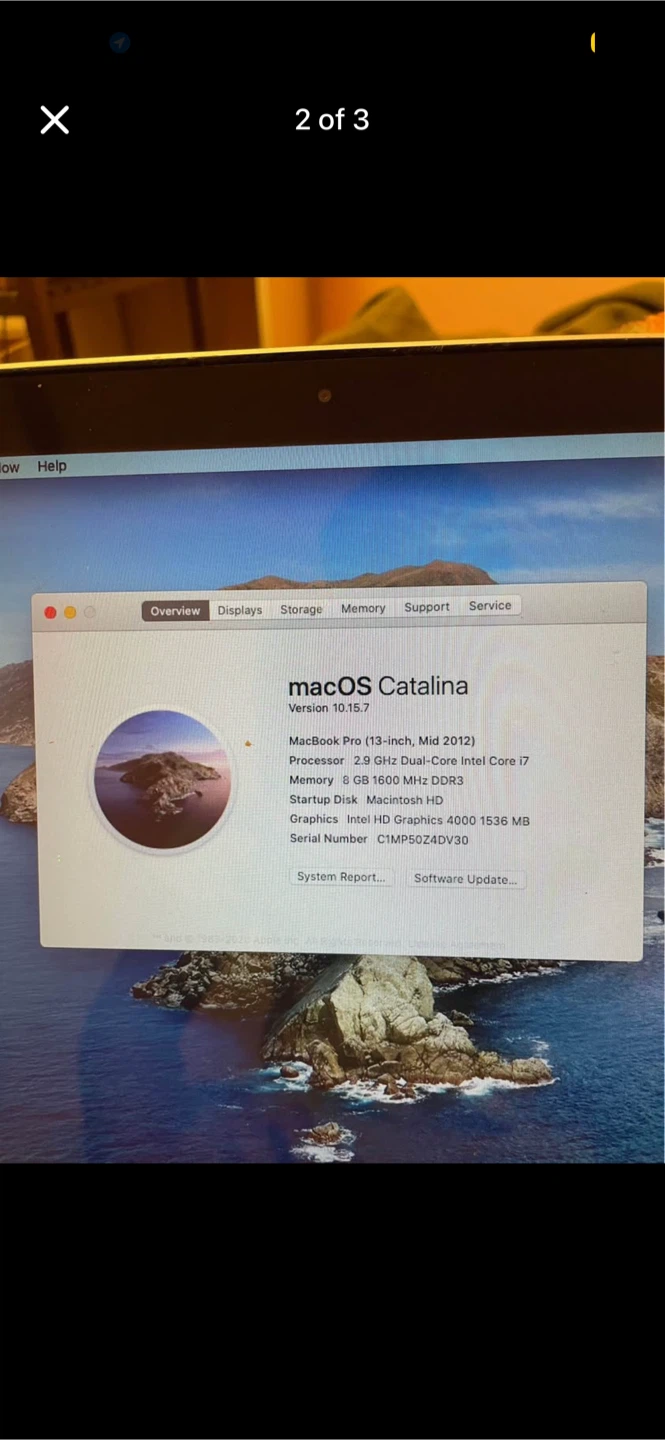MacBook Pro (13-inch, Mid 2012) running macOS Catalina. It's powered by a 2.9 GHz Dual-Core Intel Core i7 processor and has 8 GB 1600 MHz DDR3 memory. Storage is a 1 TB SATA Disk. Graphics are Intel HD Graphics 4000.