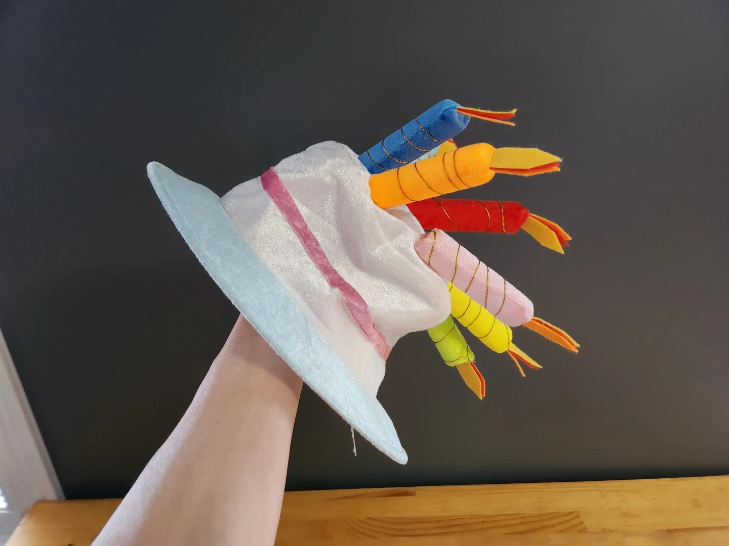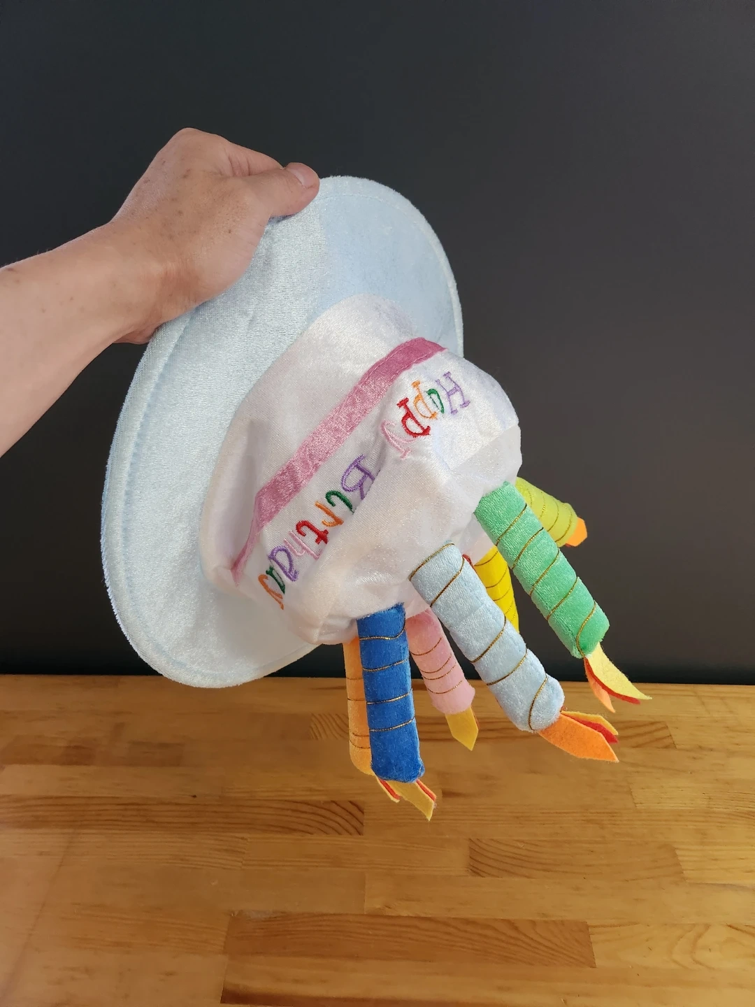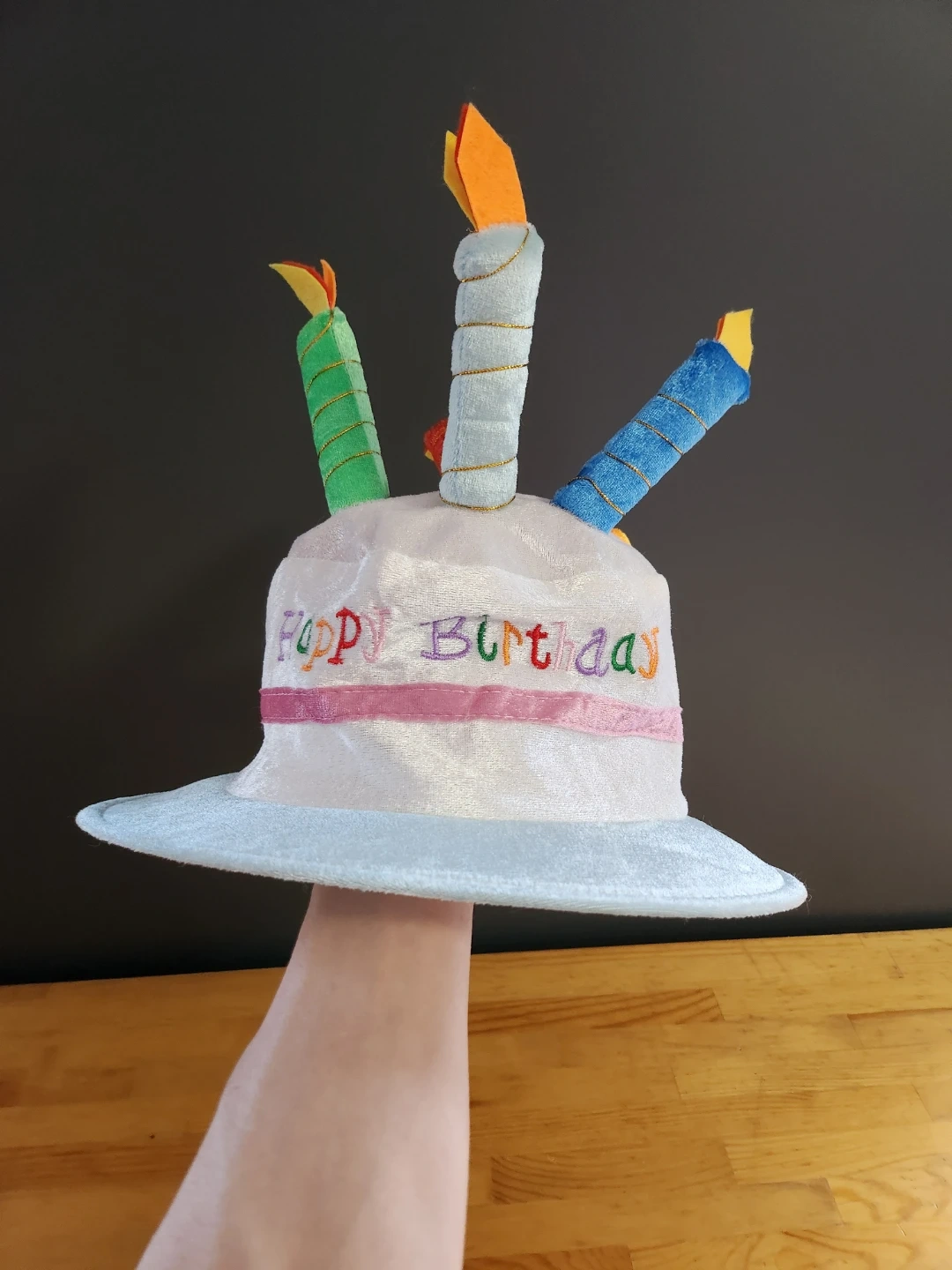 - Design: The hat typically features "Happy Birthday" embroidered on the front and is topped with several plush, fiber-filled candles with felt "flames".