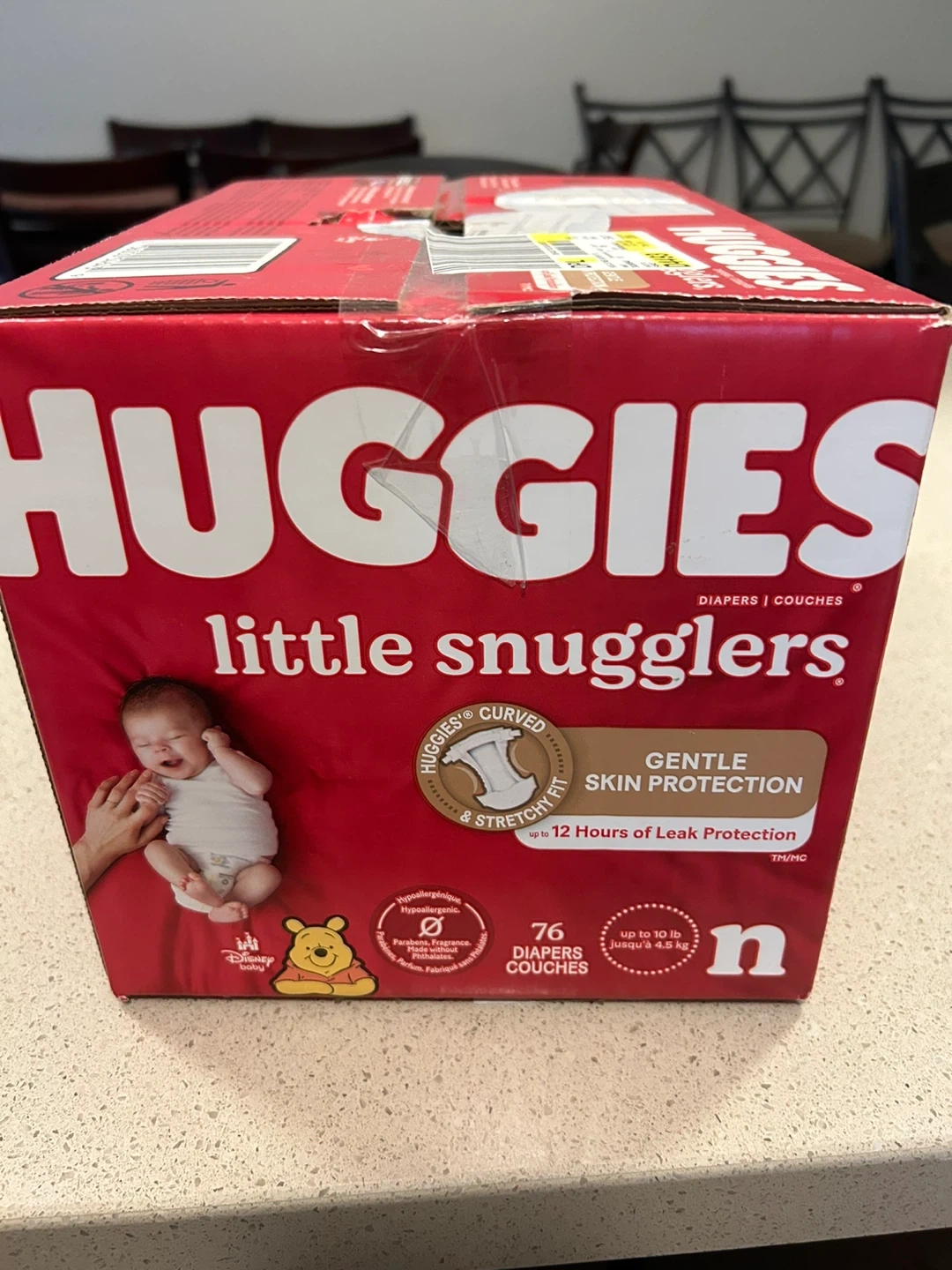 Selling a box of Huggies Little Snugglers diapers. The box contains 76 diapers, perfect for newborns up to 10 kg (22 lbs). These diapers offer gentle skin protection and up to 12 hours of leak protection. They're hypoallergenic and feature a curved and stretchy fit for baby's comfort. Unopened box