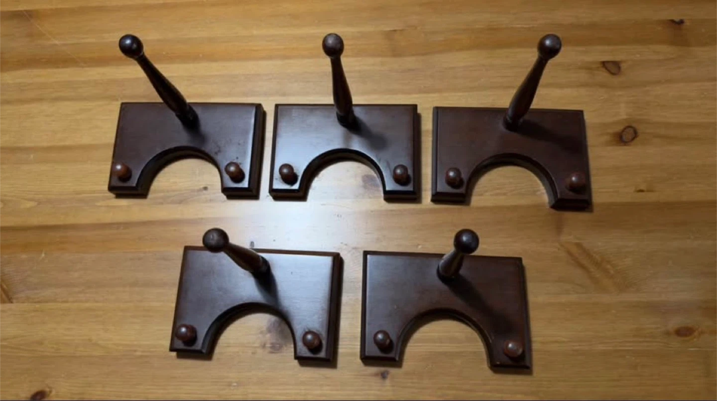 This is a set of five dark wood wall hooks. Each hook has a decorative knob at the end of its arm. They're perfect for hanging coats, hats, or bags by the door. The wood is a rich, dark brown colour. Smoke free home. Please check out my other listings.