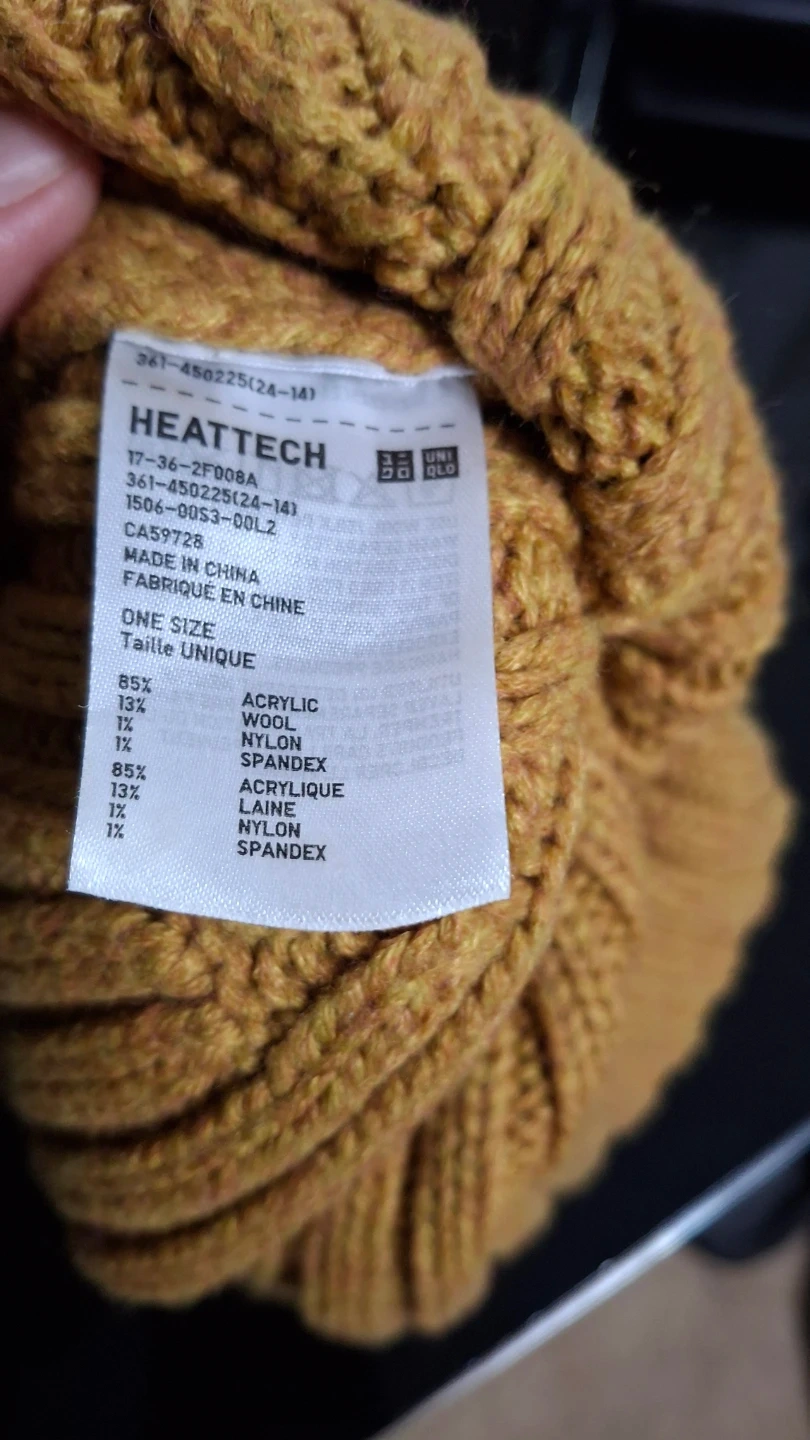 A warm knit beanie from Uniqlo's HEATTECH line. It's made with acrylic, wool, and spandex for a comfortable fit. This one-size-fits-most hat is perfect for cooler weather!