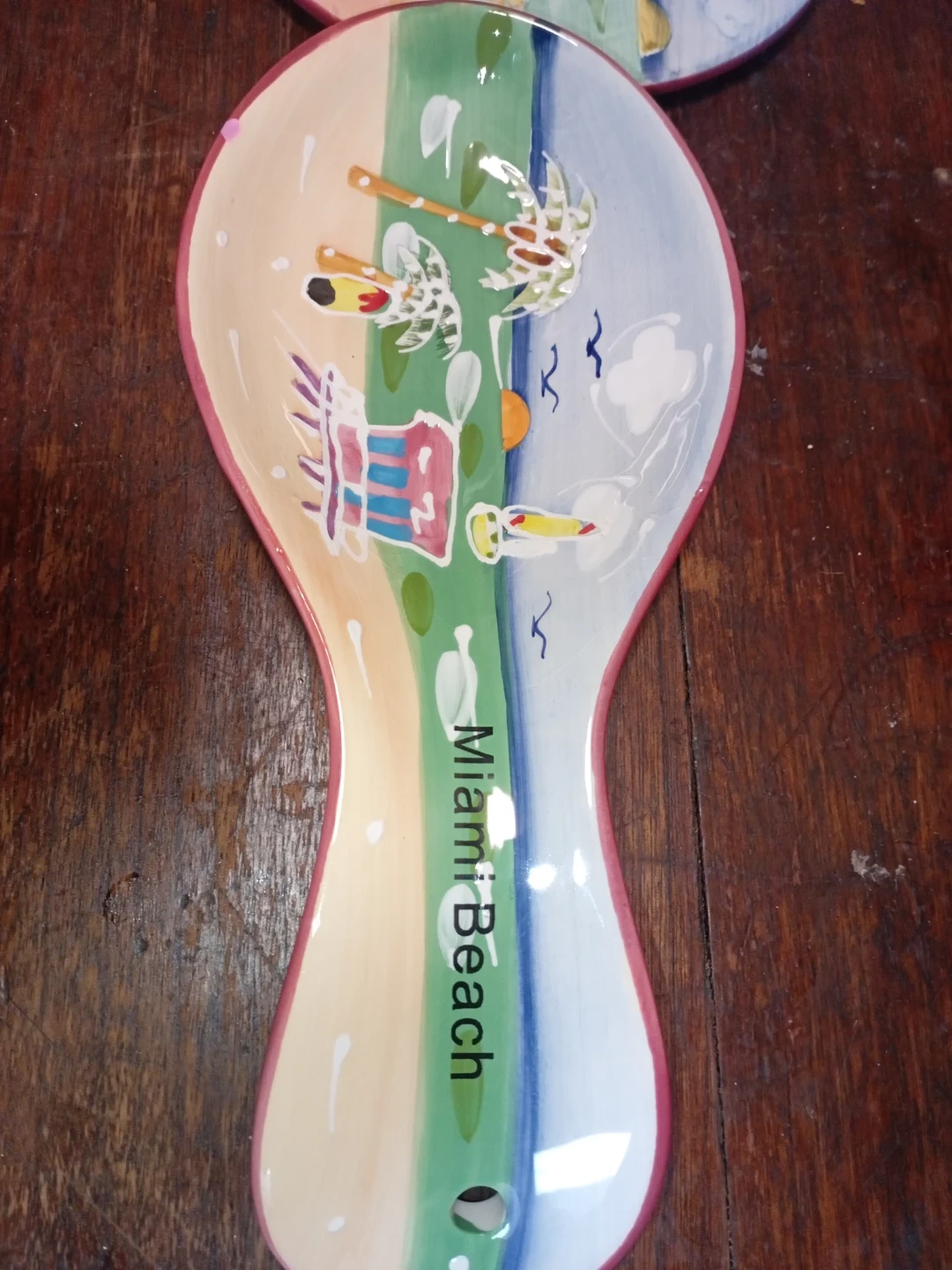 Ceramic spoon rest and matching trivet with a vibrant Miami Beach design. Both pieces feature colorful tropical scenes with palm trees and beach huts. Great for protecting your countertops!