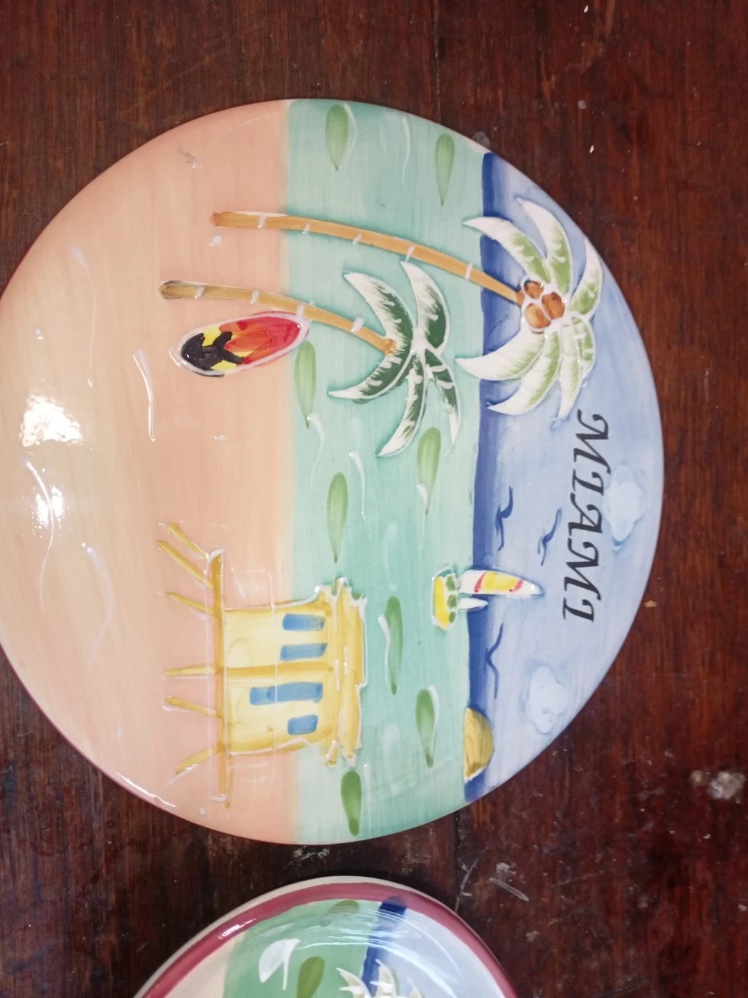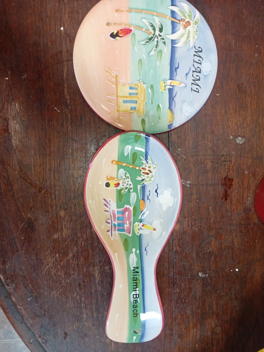 Ceramic spoon rest and matching trivet with a vibrant Miami Beach design. Both pieces feature colorful tropical scenes with palm trees and beach huts. Great for protecting your countertops!