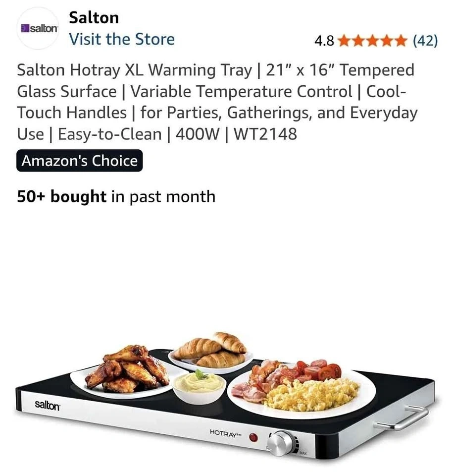 Perfect for hosting your big game gathering, the Salton Hotray XL’s large 21” x 16” tempered glass warming surface ensures all your appetizers, snacks, and main dishes stay warm and ready to serve throughout the event.
