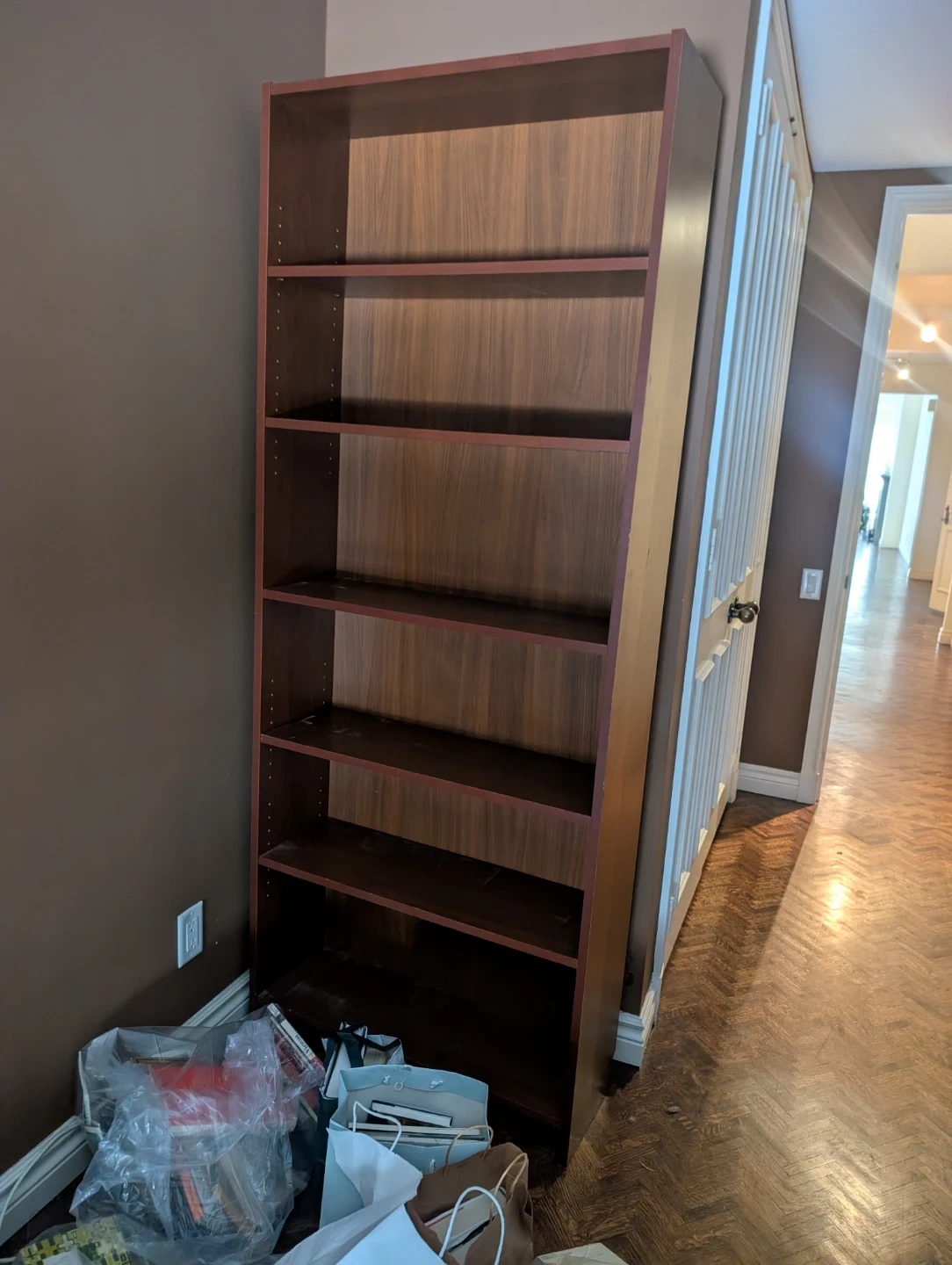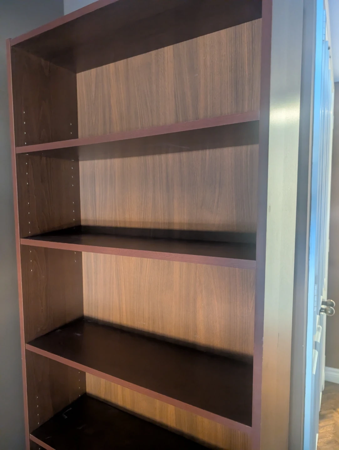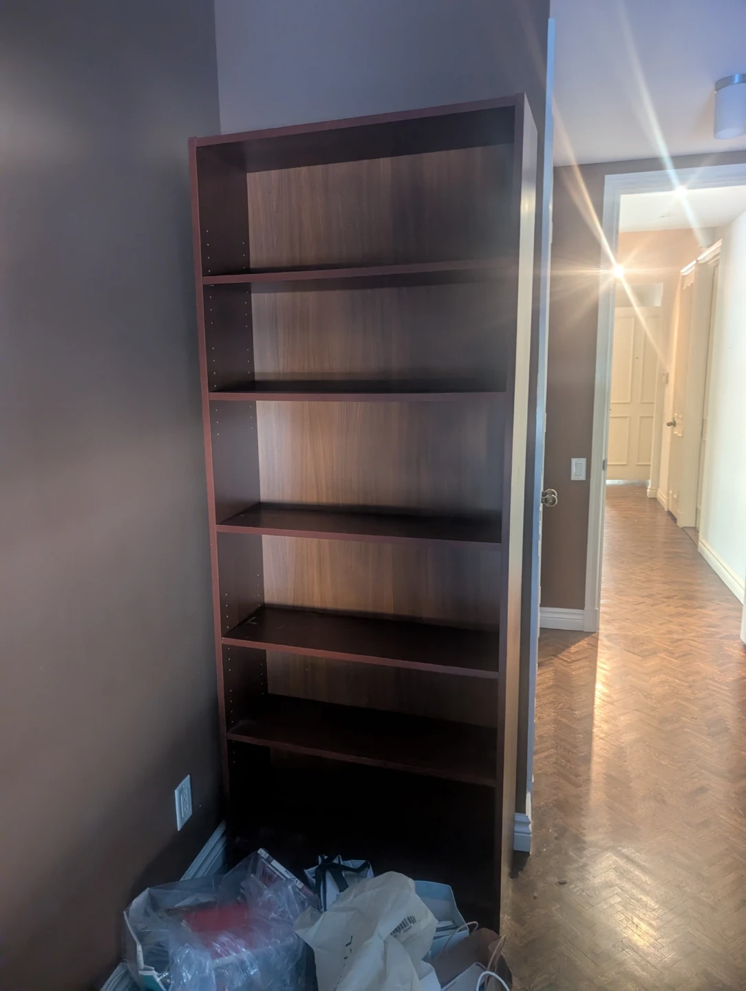 This is a dark wood bookshelf with five shelves. It's made of wood composite material. It's great for storing books or displaying items.