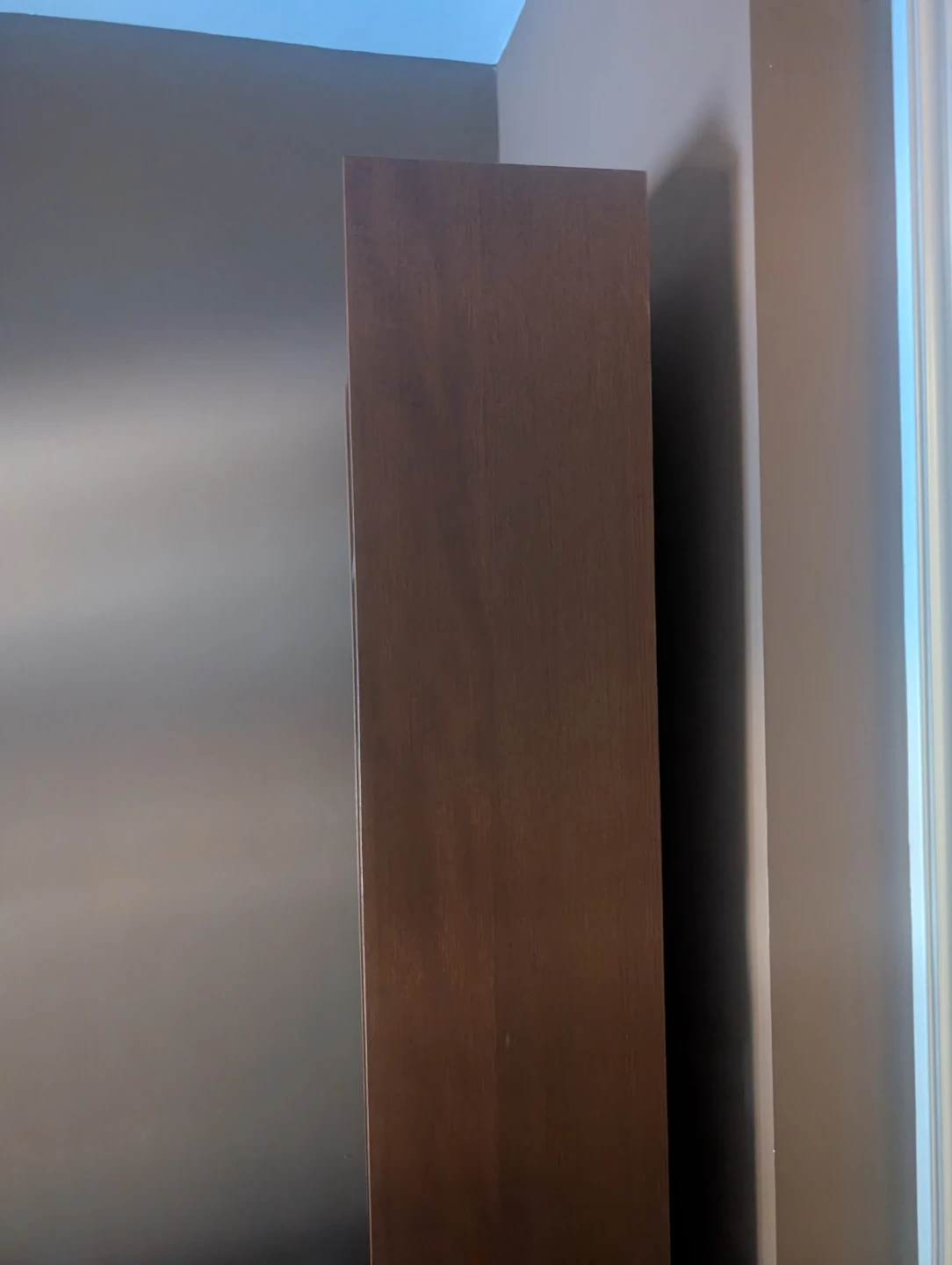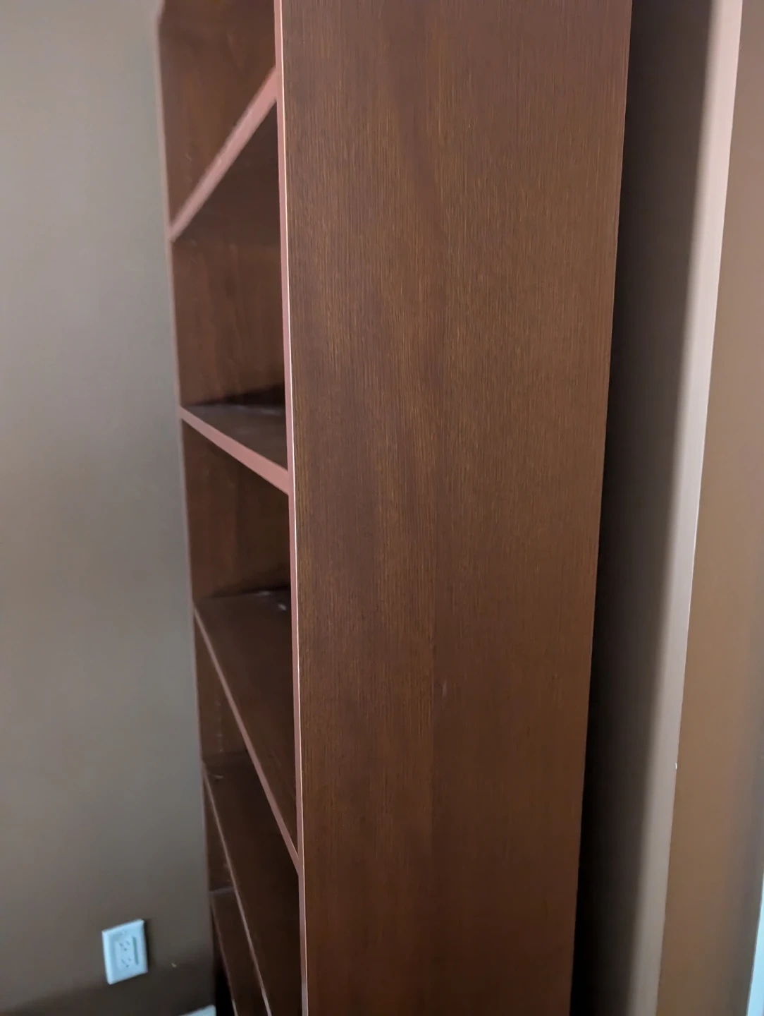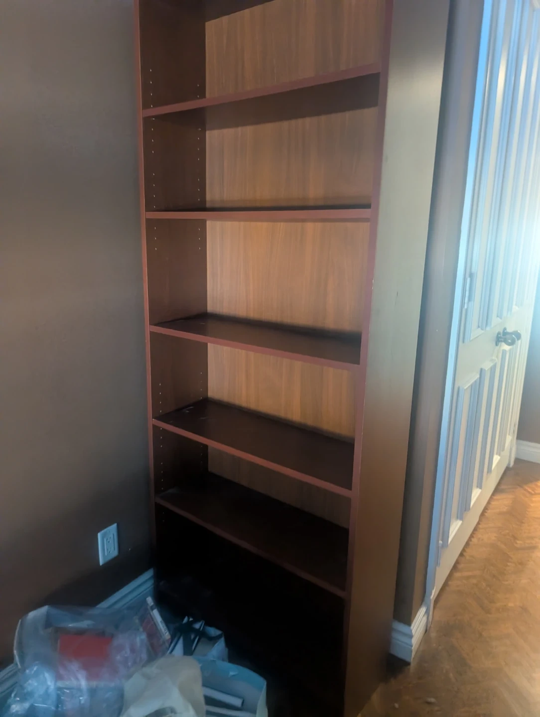 This is a dark wood bookshelf with five shelves. It's made of wood composite material. It's great for storing books or displaying items.