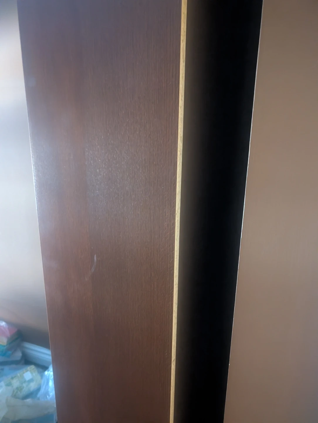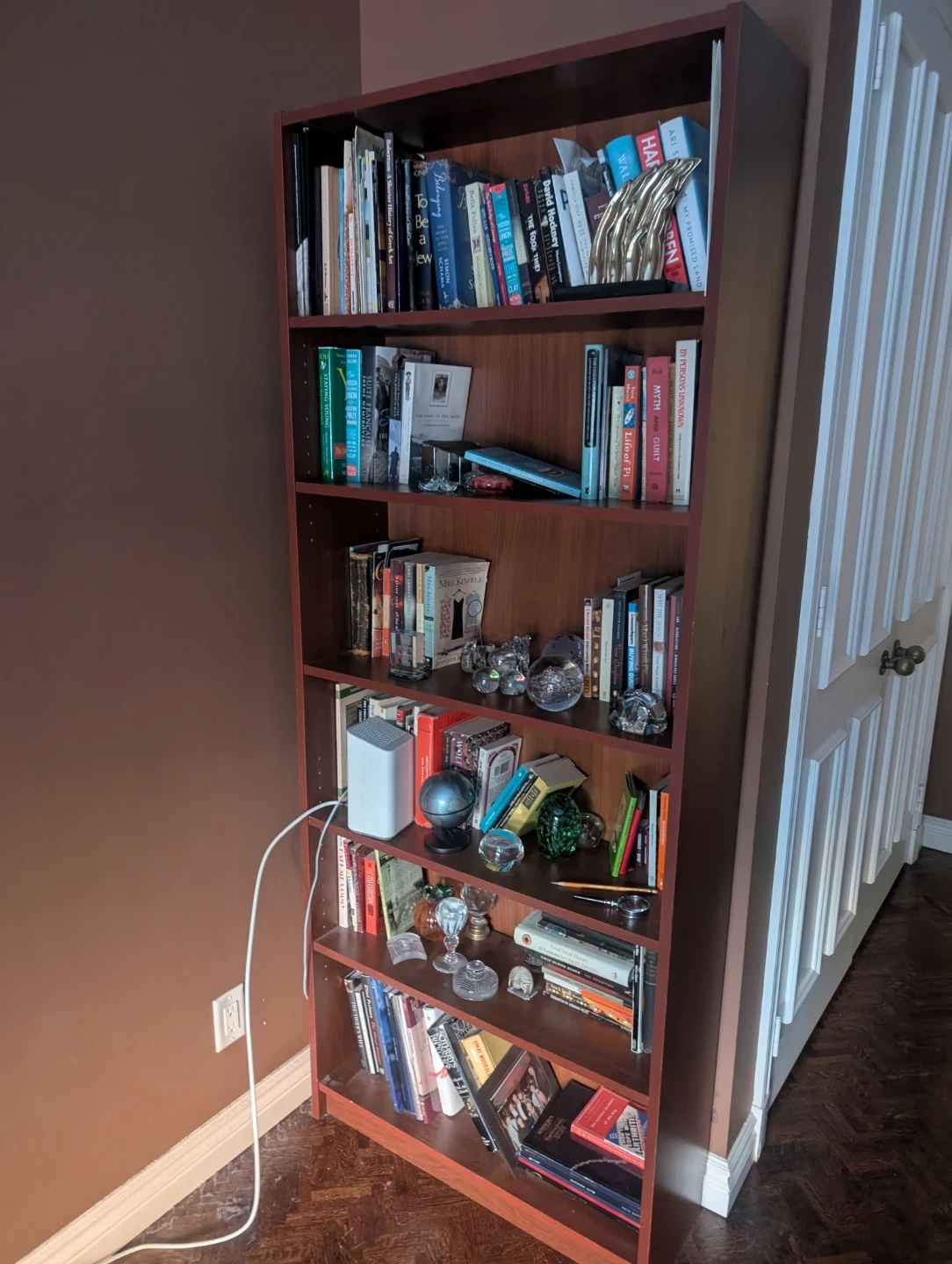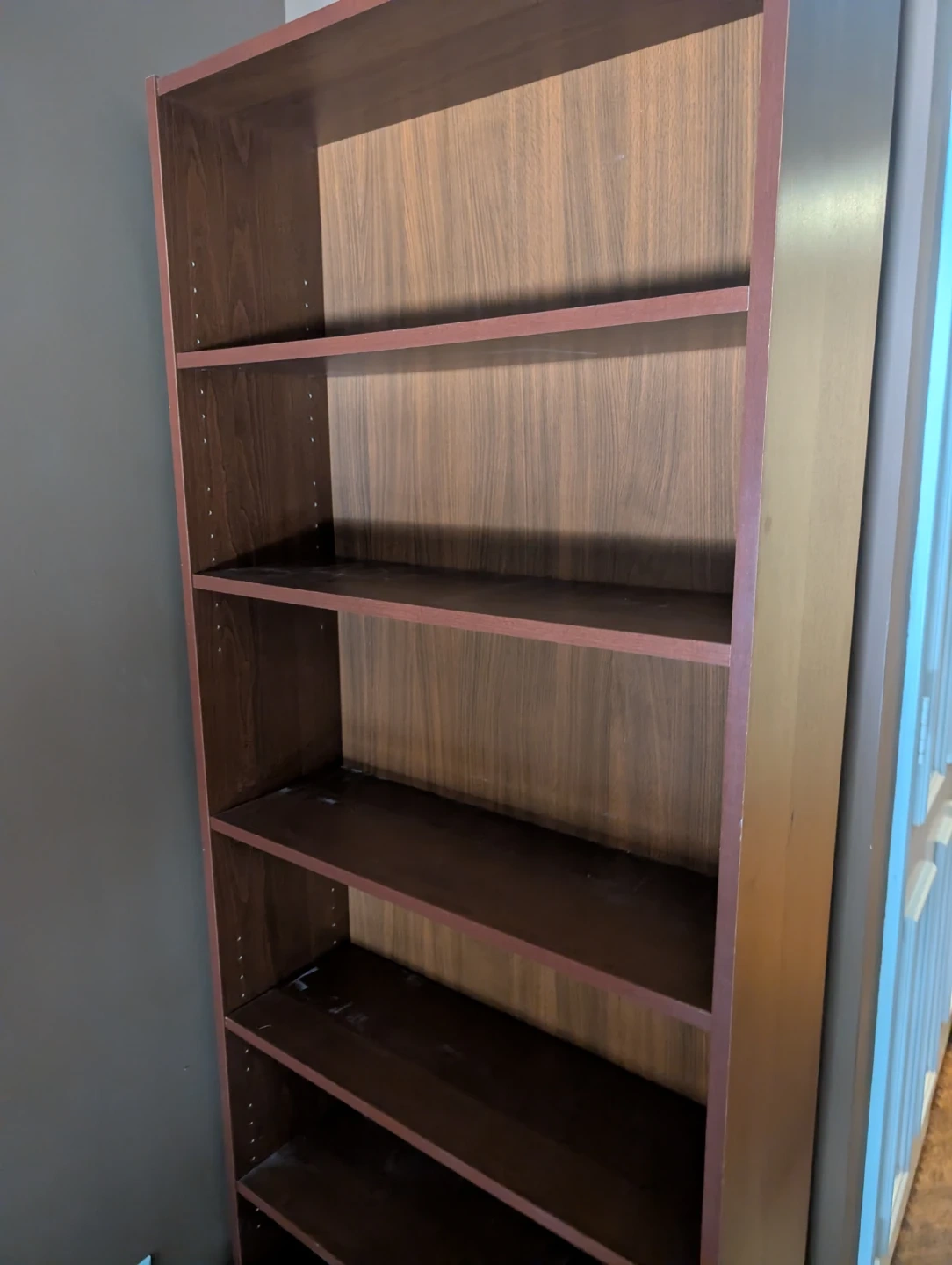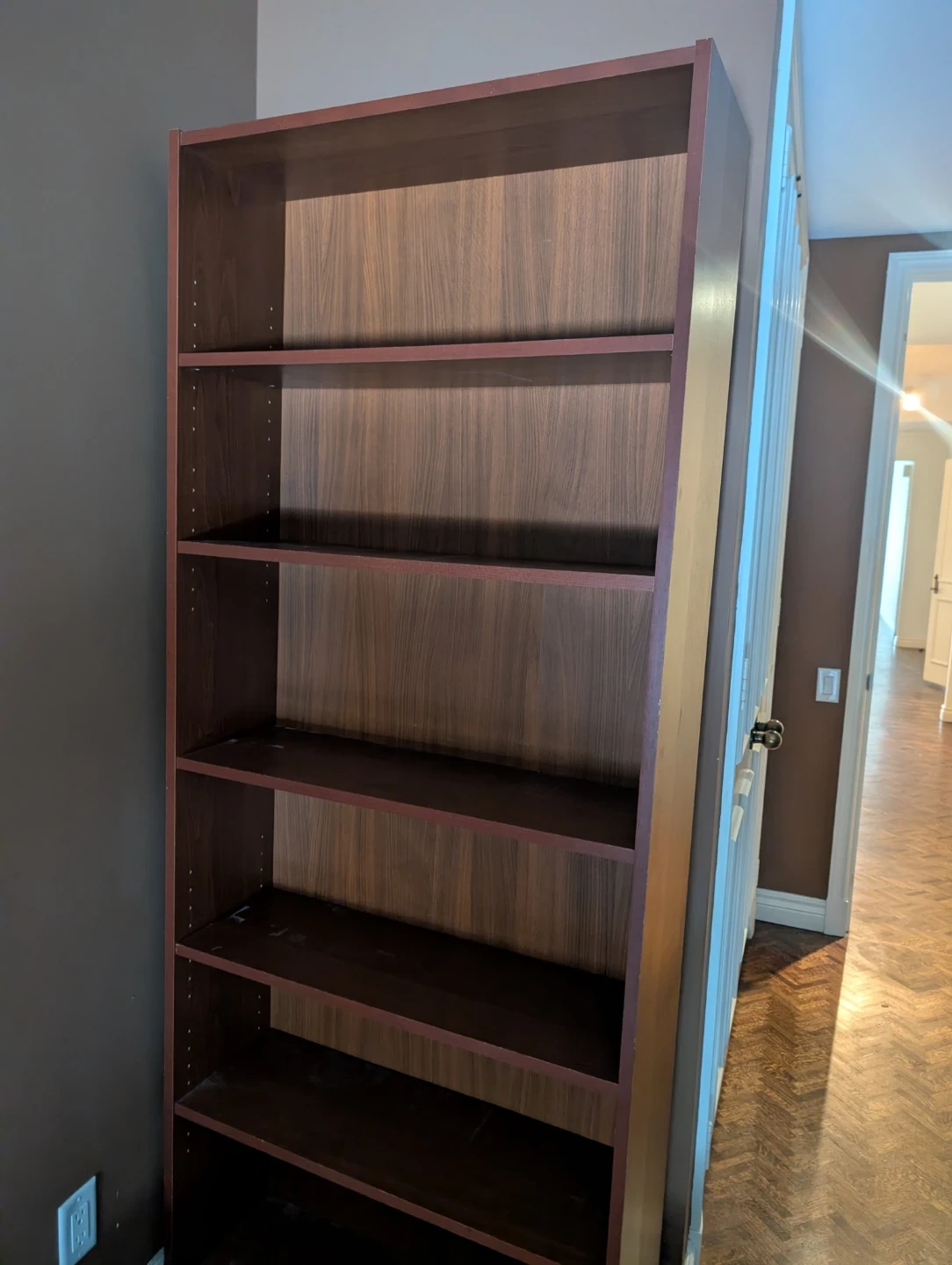 This is a dark wood bookshelf with five shelves. It's made of wood composite material. It's great for storing books or displaying items.