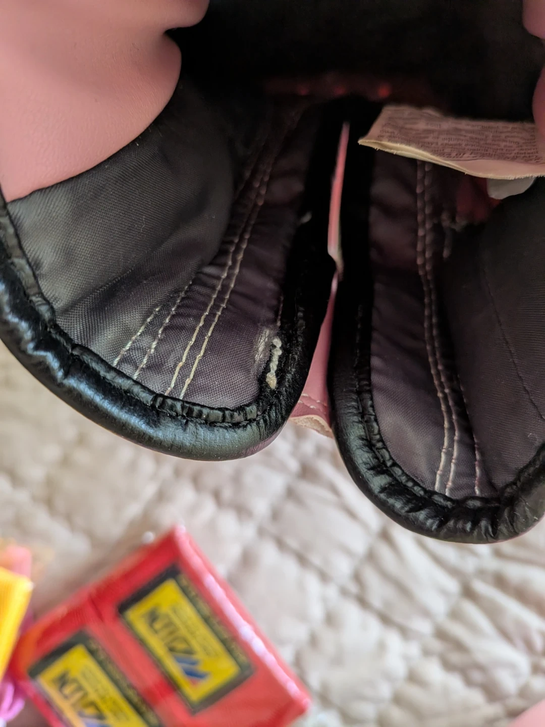 Pink boxing gloves, size 10oz. In great used condition - only used for at-home video workouts without bags, and even so very rarely used in the past couple of years. Some light imperceptible coloured stains I tried to capture on camera, likely from the bag I stored then in. There's a very small rip inside the left glove - I think when I tried to pull the velcro - but doesn't affect the function. Includes pink hand wraps (also used but cleaned) and two pairs of new yellow and red hand wraps. Perfect for training sessions!