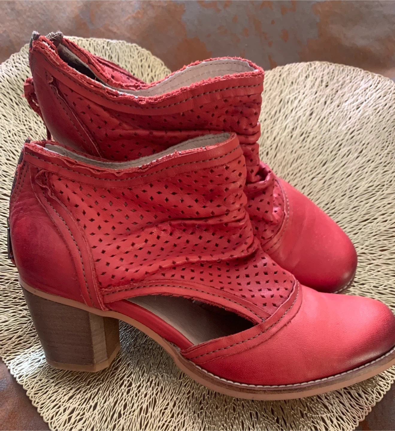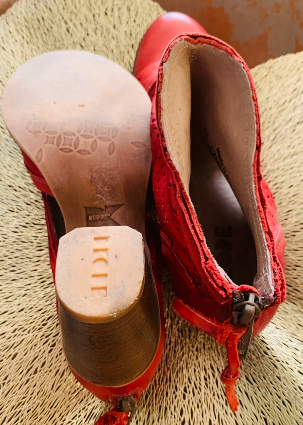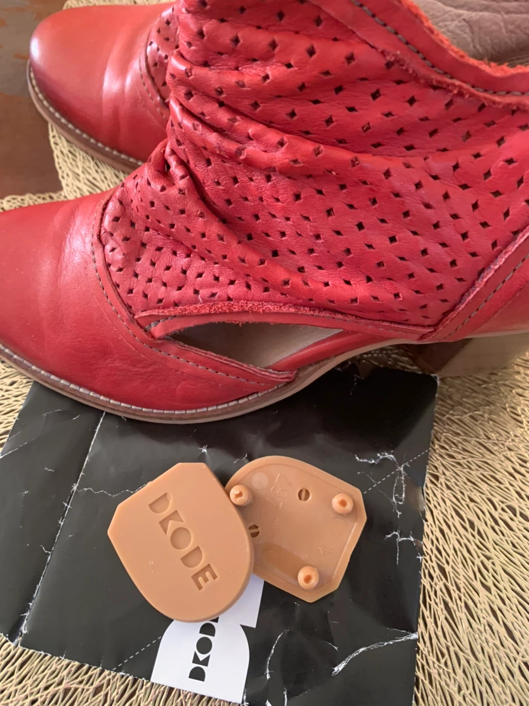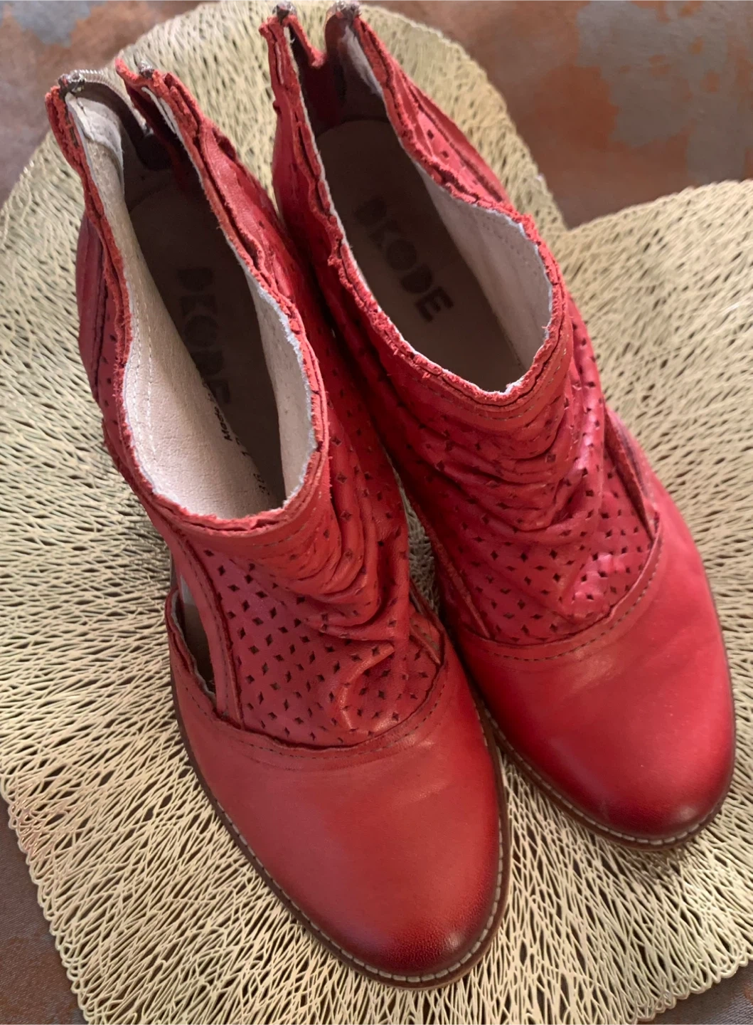 Stylish DKODE ankle boots in a vibrant red hue. Features a perforated design and a comfortable heel. Includes original replacement heel taps.