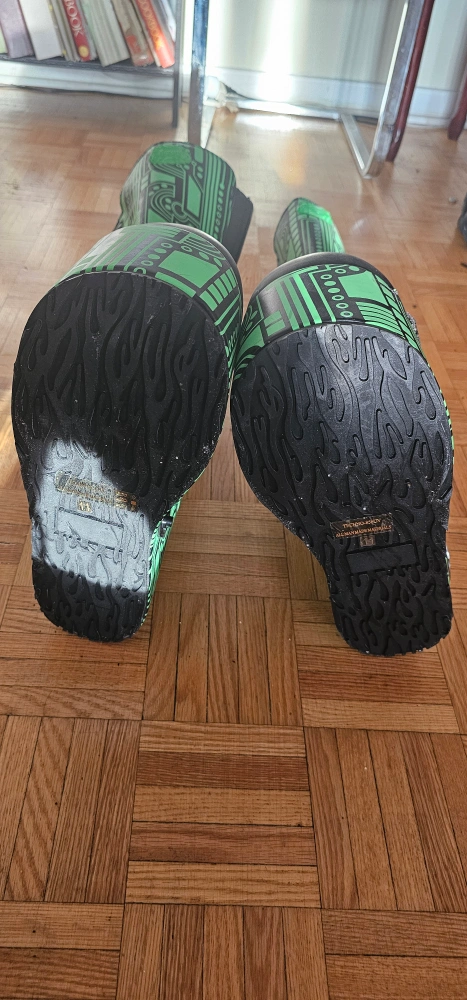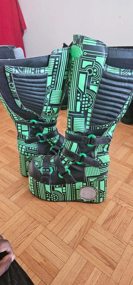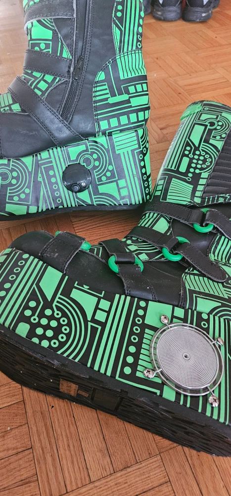 Never worn. 4″ Platform Cyber Goth Knee Boot with Light Mechanism Built Into Platform. Uv-reactive.