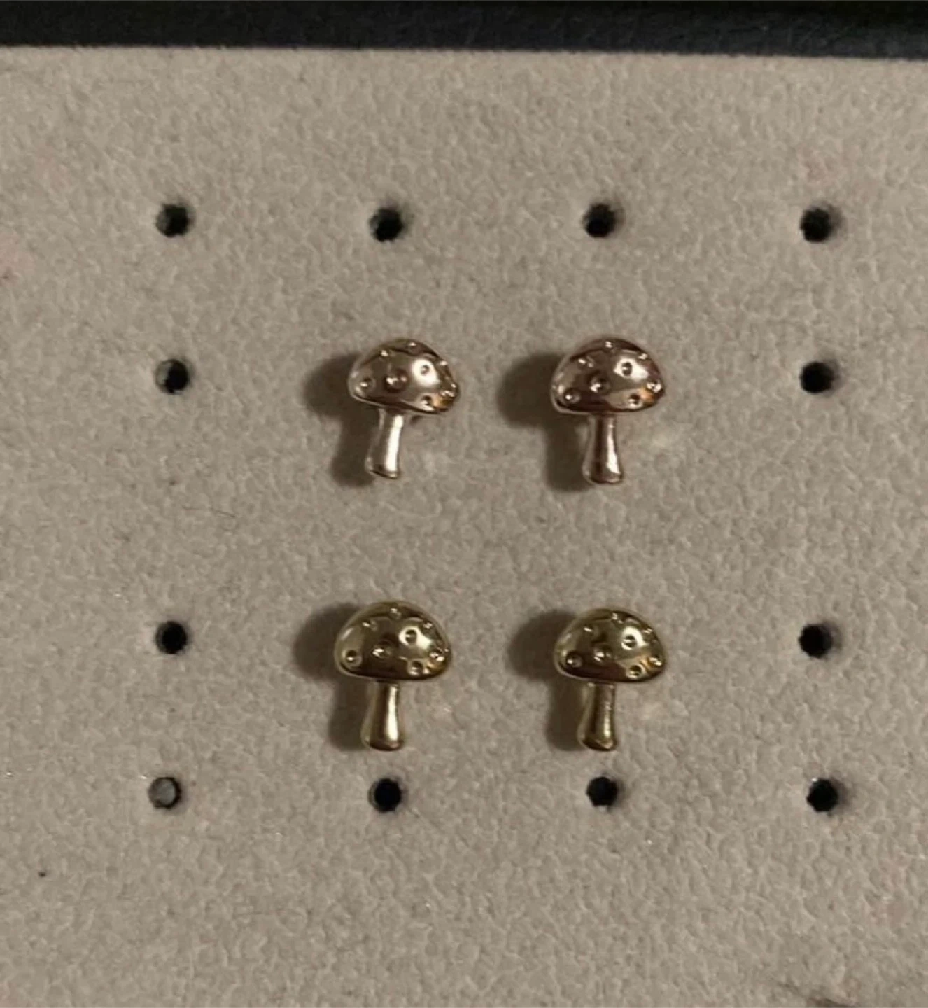 Mushroom stud earrings. Never worn. I’m a silver girl. They came in a set. My silver ones haven’t tarnished and I’ve had them for years.