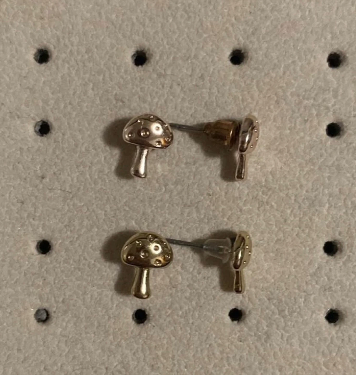 Mushroom stud earrings. Never worn. I’m a silver girl. They came in a set. My silver ones haven’t tarnished and I’ve had them for years.