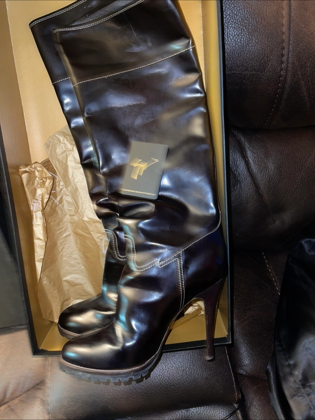 These are a pair of Giuseppe Zanotti knee-high boots in black leather. They come with the original box. They have a high heel and a sleek, stylish design