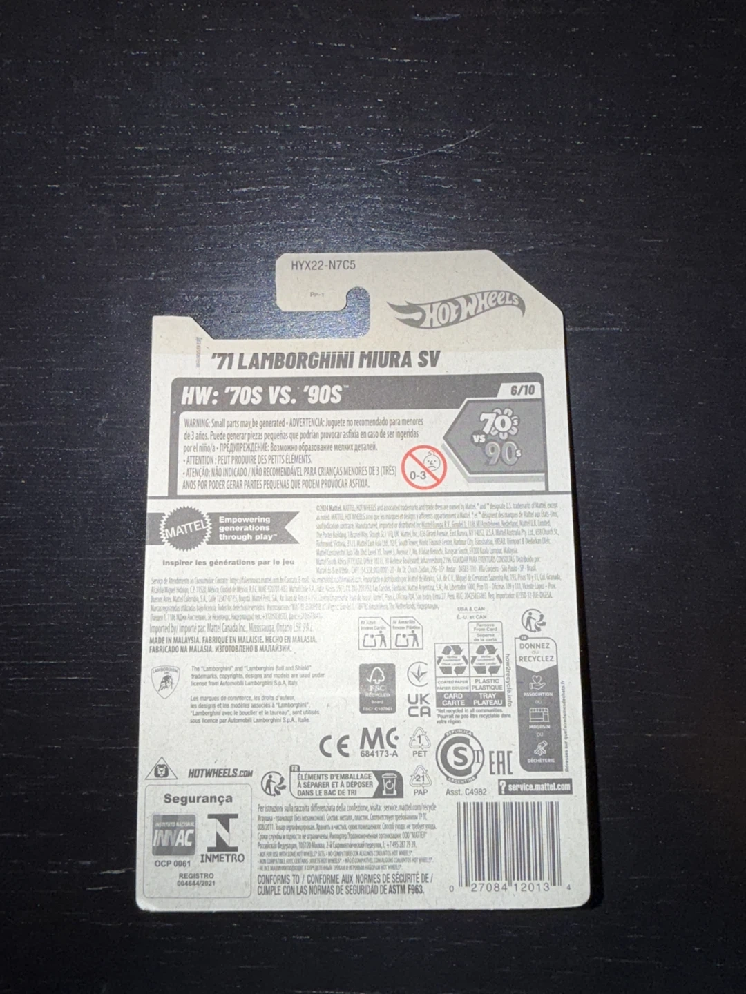 Selling a Hot Wheels '71 Lamborghini Miura SV from the '70s vs '90s series. The packaging is in great shape and the car looks awesome!