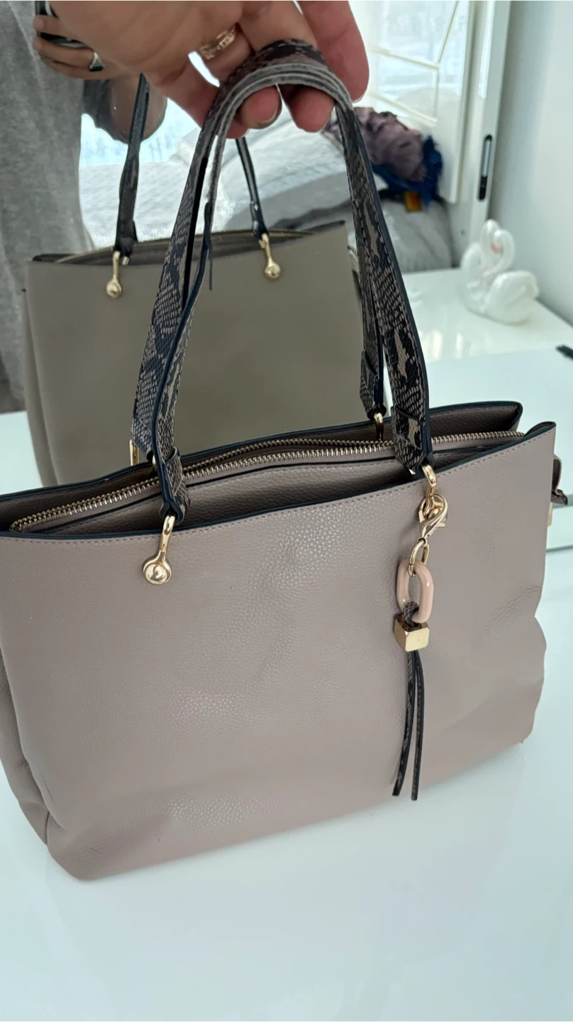 Chic taupe tote bag crafted from textured faux leather. It features stylish snake print shoulder straps and a zip closure. A decorative tassel charm adds a nice detail.
