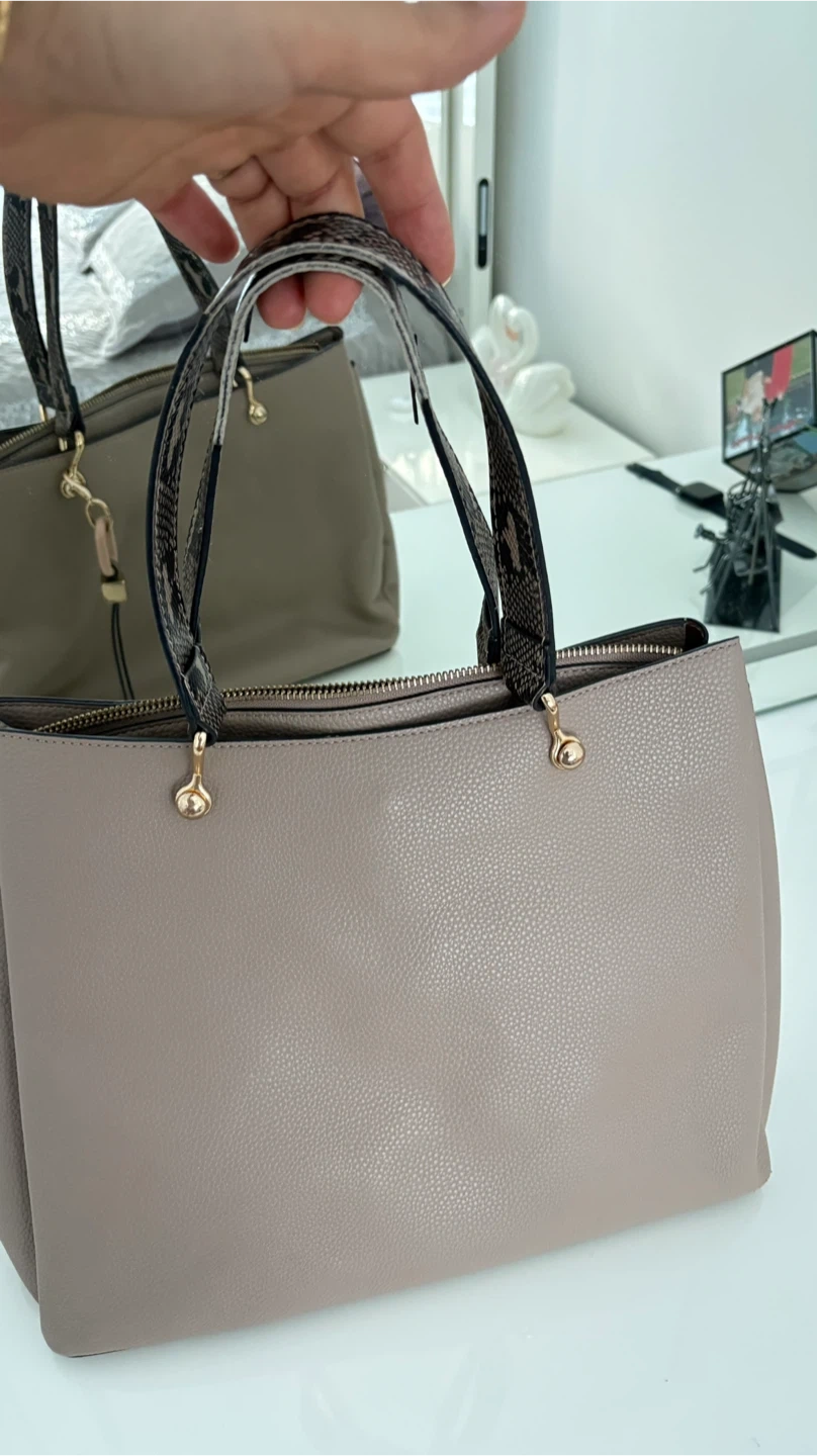 Taupe Faux Leather Tote Bag with Snake Print Straps