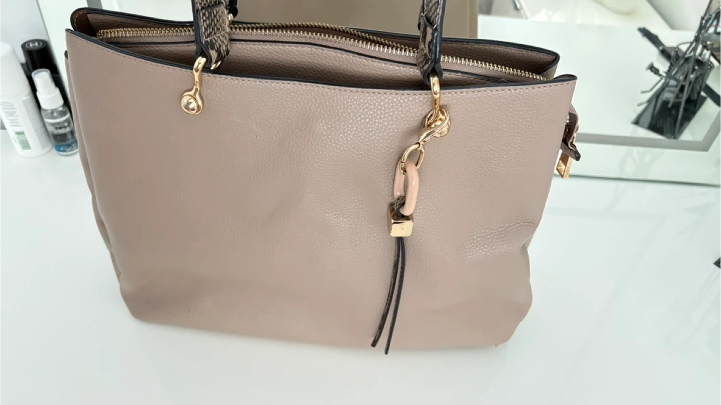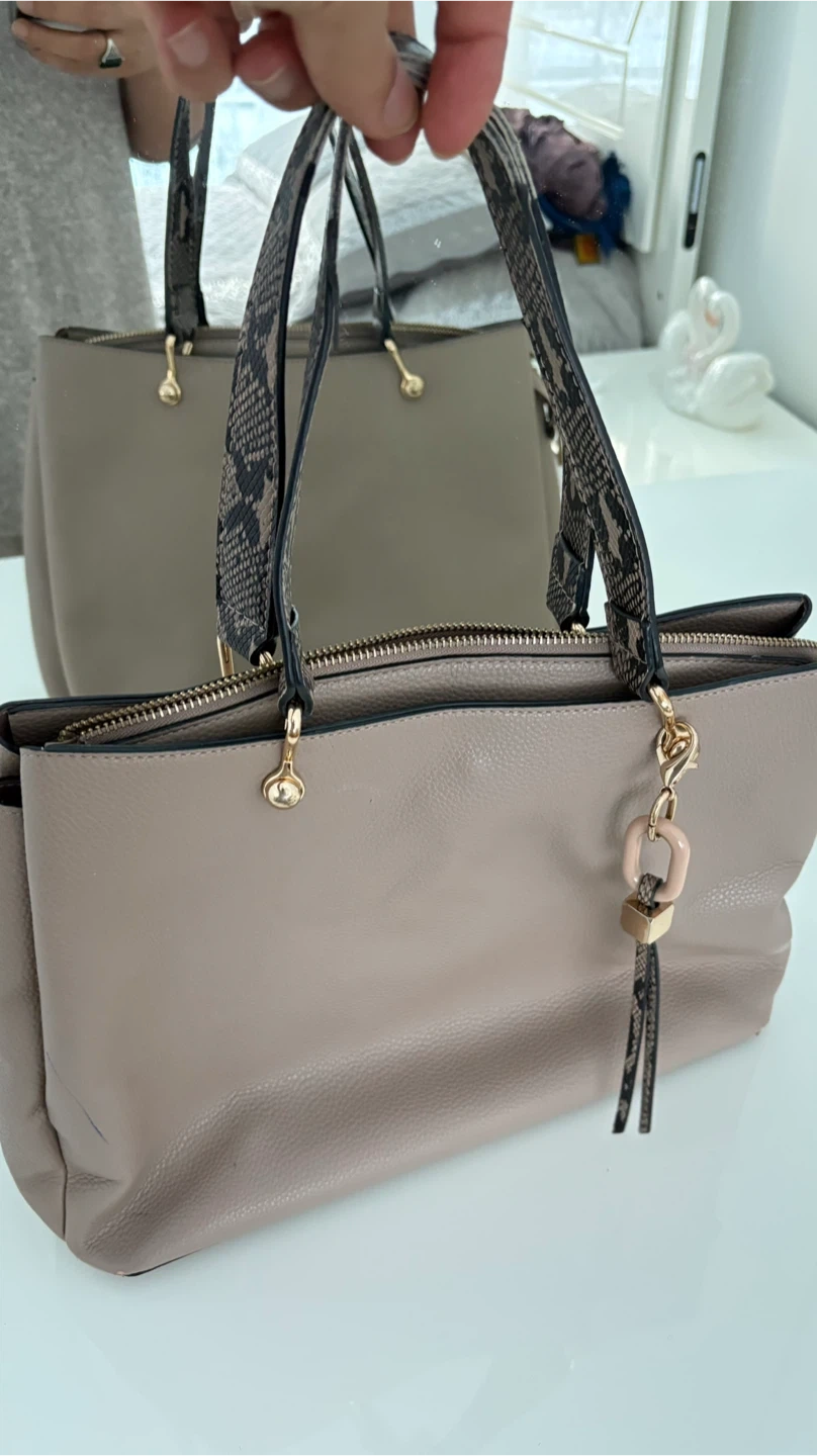 Chic taupe tote bag crafted from textured faux leather. It features stylish snake print shoulder straps and a zip closure. A decorative tassel charm adds a nice detail.