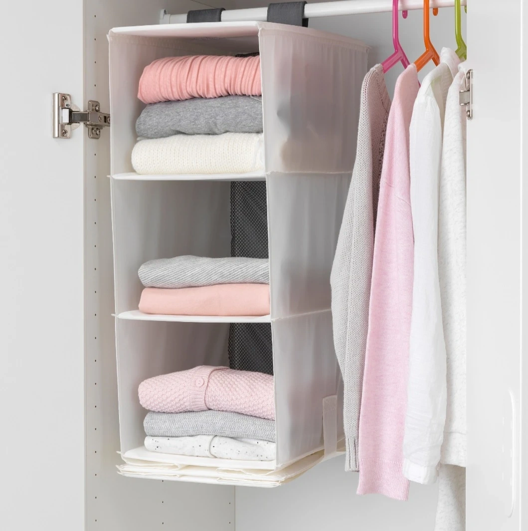 This hanging closet organizer features five spacious shelves for storing clothes and accessories. It's made from durable fabric with mesh sides for ventilation. Perfect for compartmentalizing your closet space!