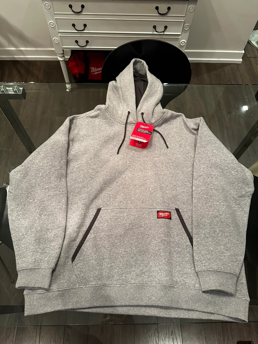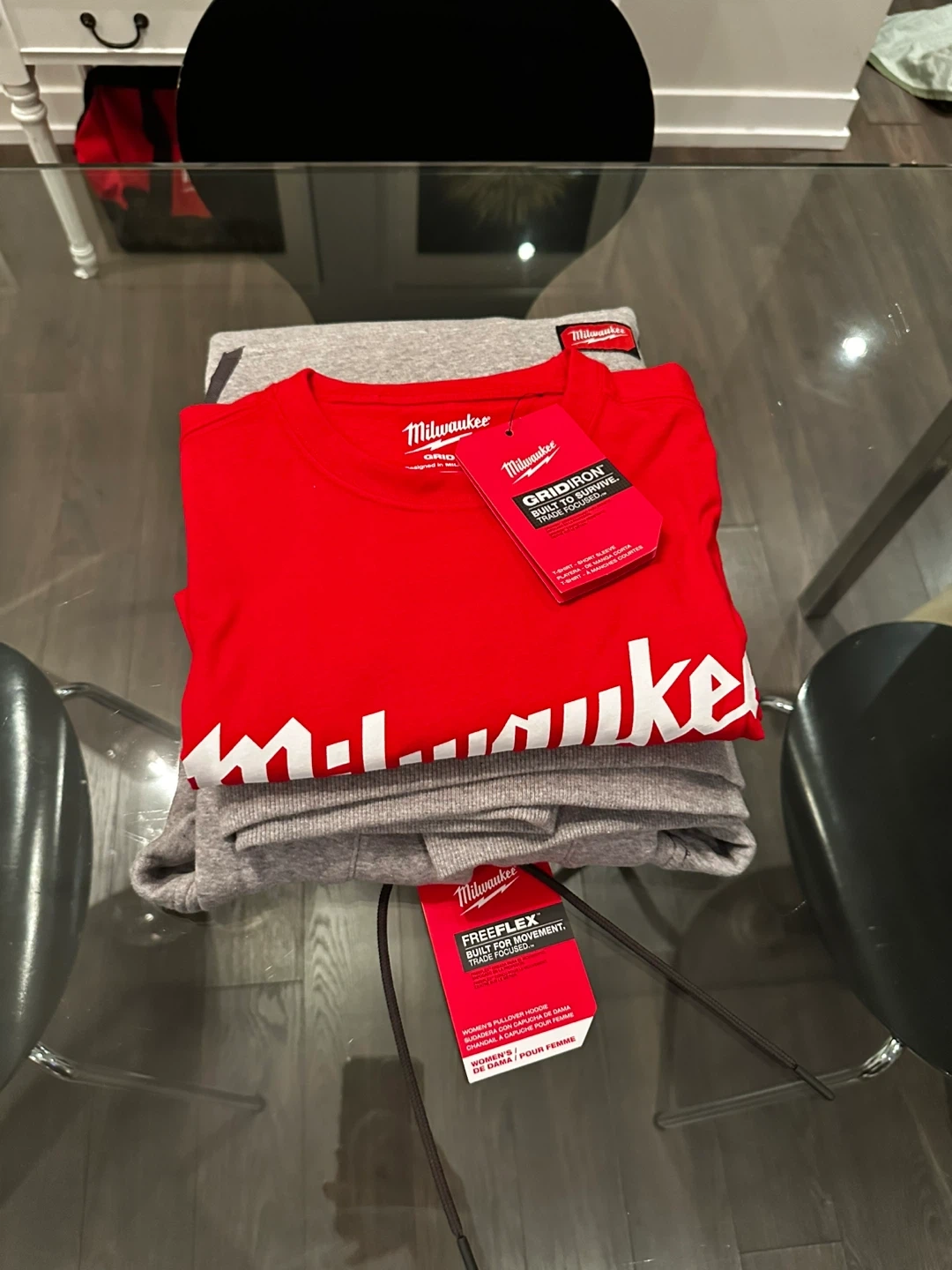 Includes a Milwaukee red short-sleeve t-shirt and a grey Milwaukee hoodie. The t-shirt is size M and the hoodie is size large. Both are made for durability and movement.