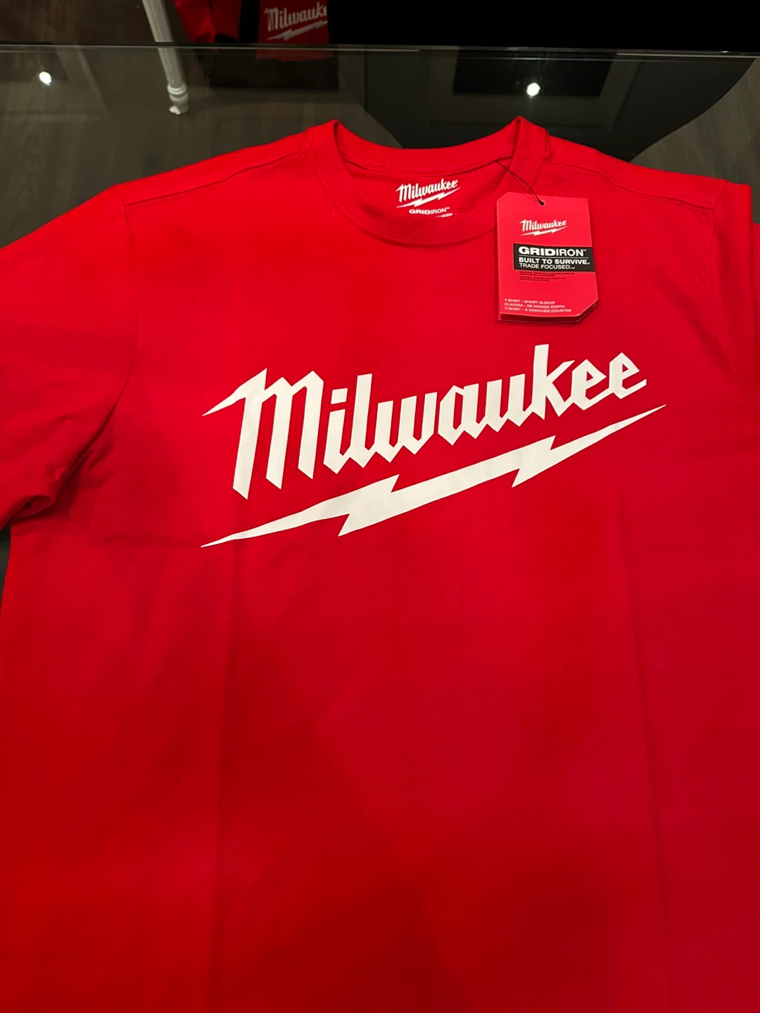 Includes a Milwaukee red short-sleeve t-shirt and a grey Milwaukee hoodie. The t-shirt is size M and the hoodie is size large. Both are made for durability and movement.