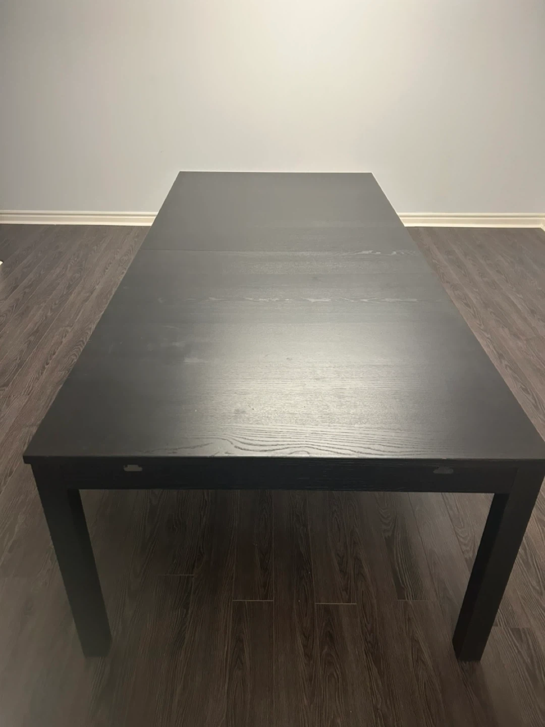 This is a rectangular dining table with a black wood-grain finish. It's a sturdy piece suitable for your dining room. Measurements are not available.