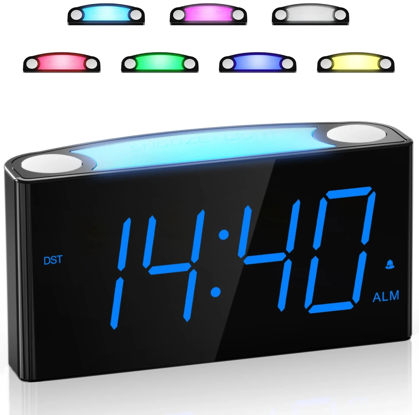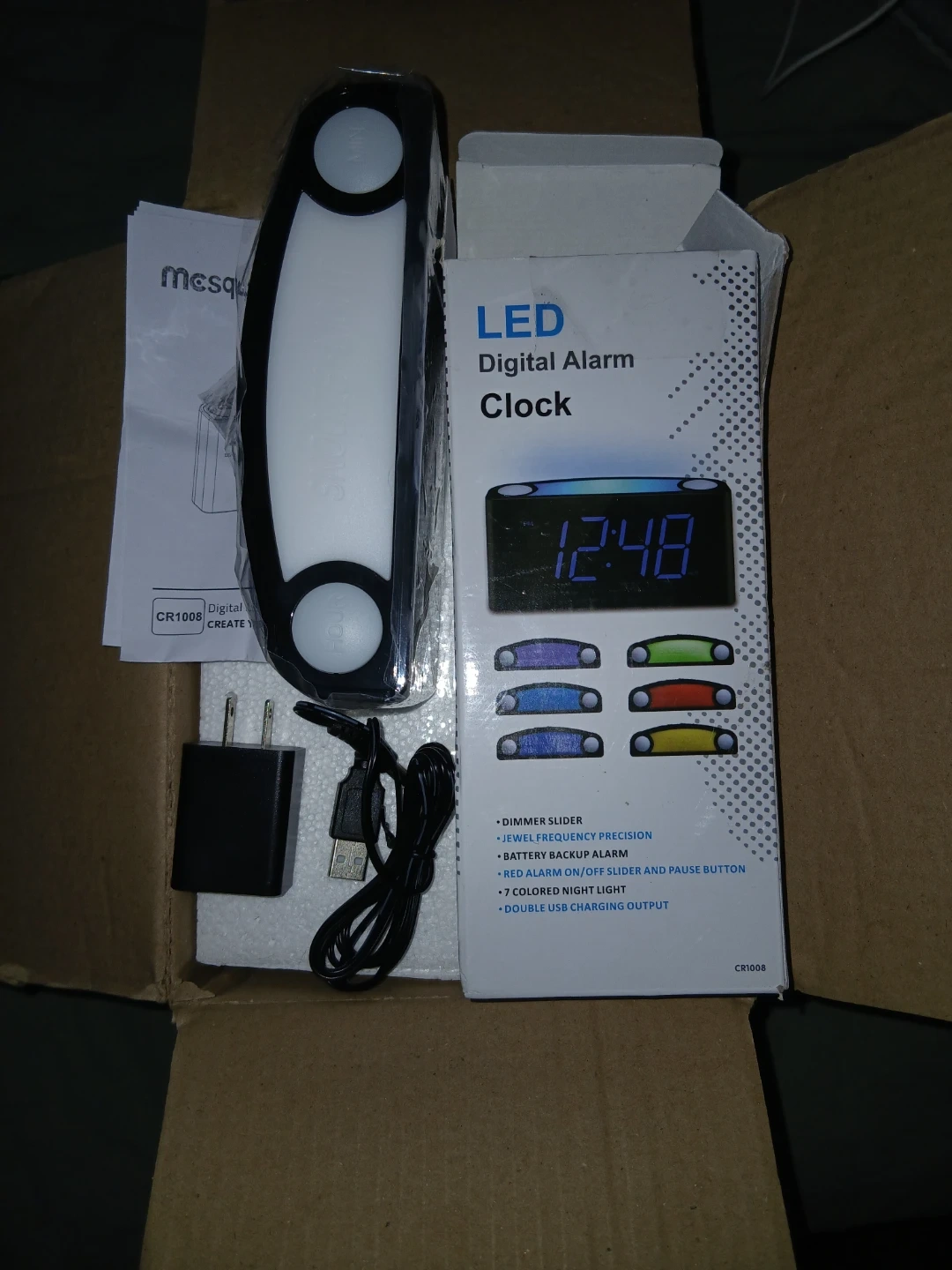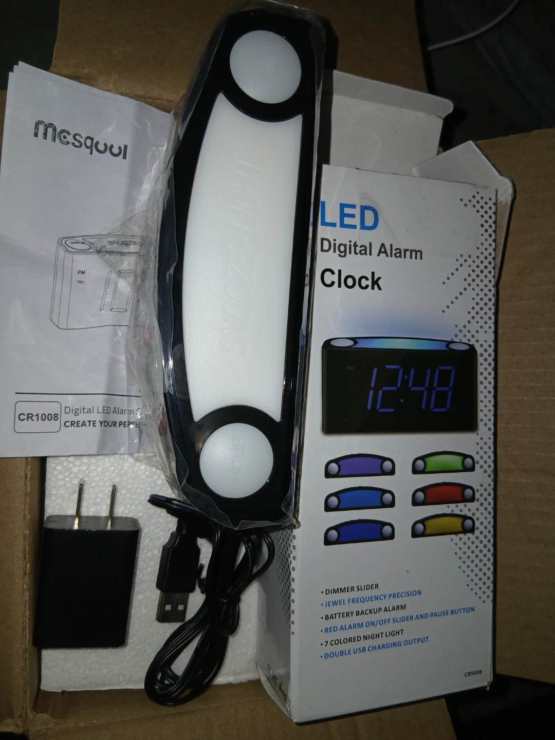 This is an LED digital alarm clock. It features a dimmer slider, jewel frequency precision, and battery backup alarm. This clock also has an LED alarm on/off slider and pause button. It offers 7 coloured night light options and double USB charging output. Great for bedrooms!
